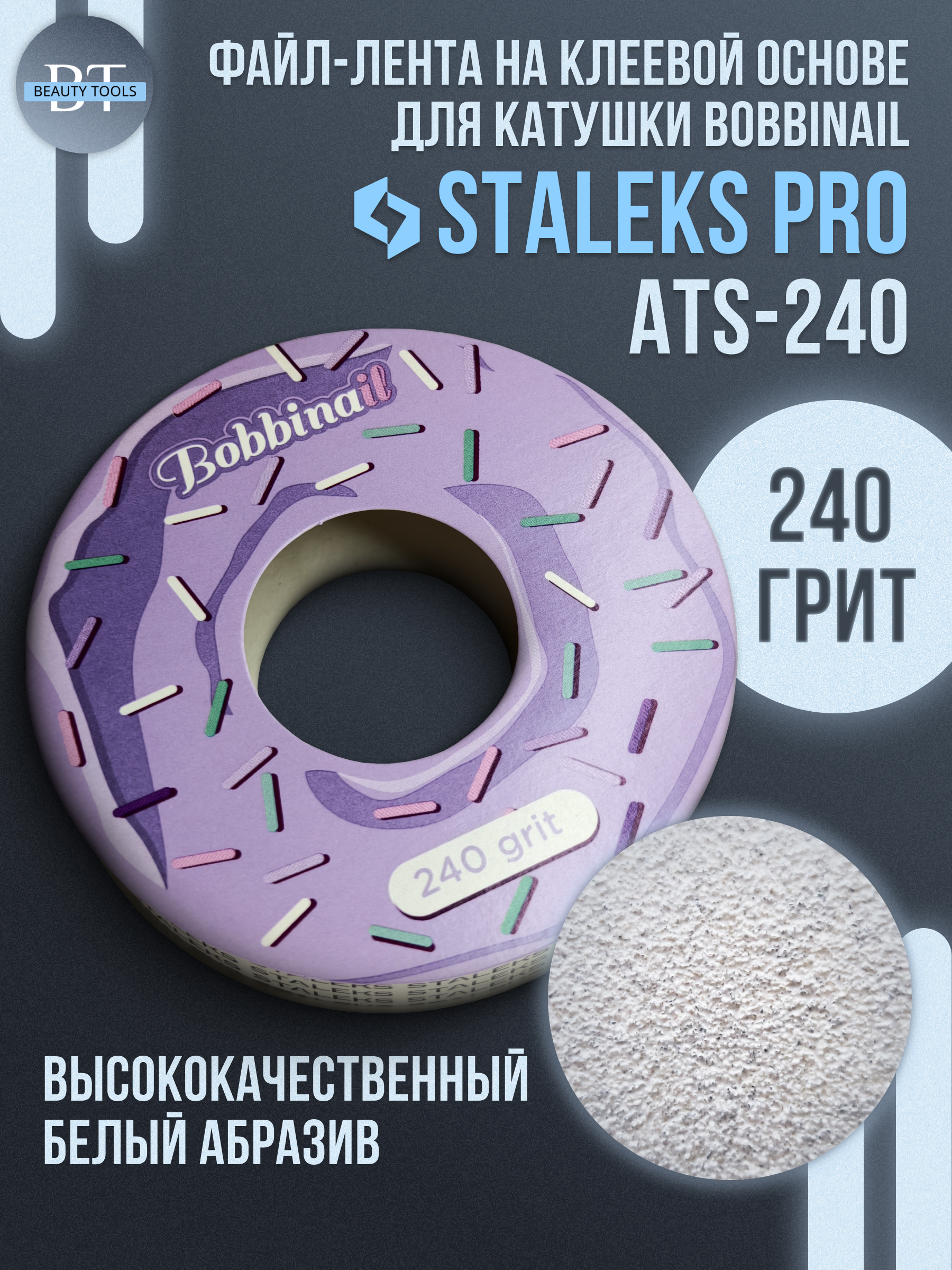 Запасной блок файл-ленты для пластиковой катушки Bobbinail STALEKS PRO 240 грит. Файлы на клеевой основе надёжно фиксируются на пилку, для удобства предусмотрена специальная клипса для деления абразивной ленты.