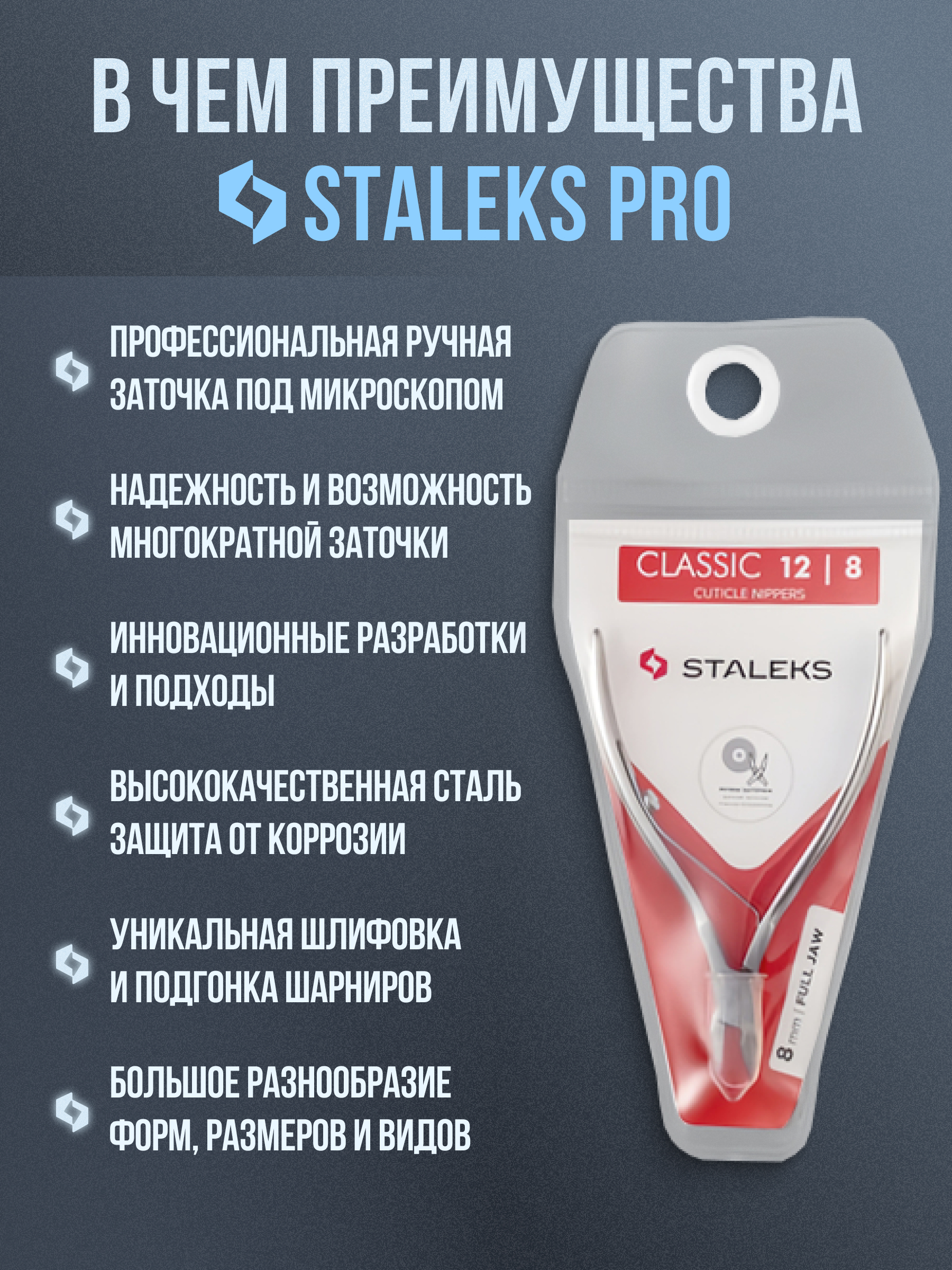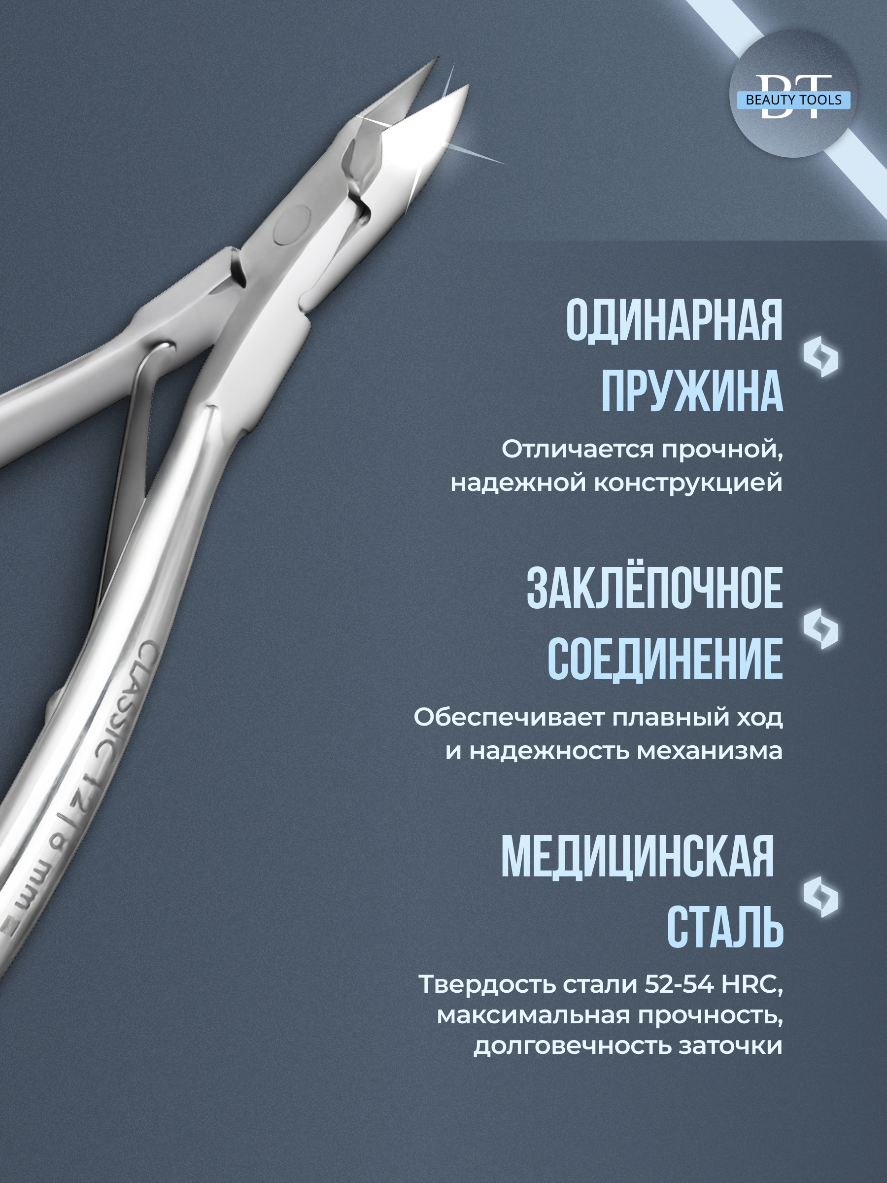 Кусачки для обработки кутикулы CLASSIC 12-8, изготовлены из высококачественной нержавеющей стали, которая длительное время не подвергается коррозии и выдерживает многократные заточки. Инструмент с одинарным типом пружины и длиной режущей кромки 8 мм устойчив ко всем видам дезинфекции и стерилизации.