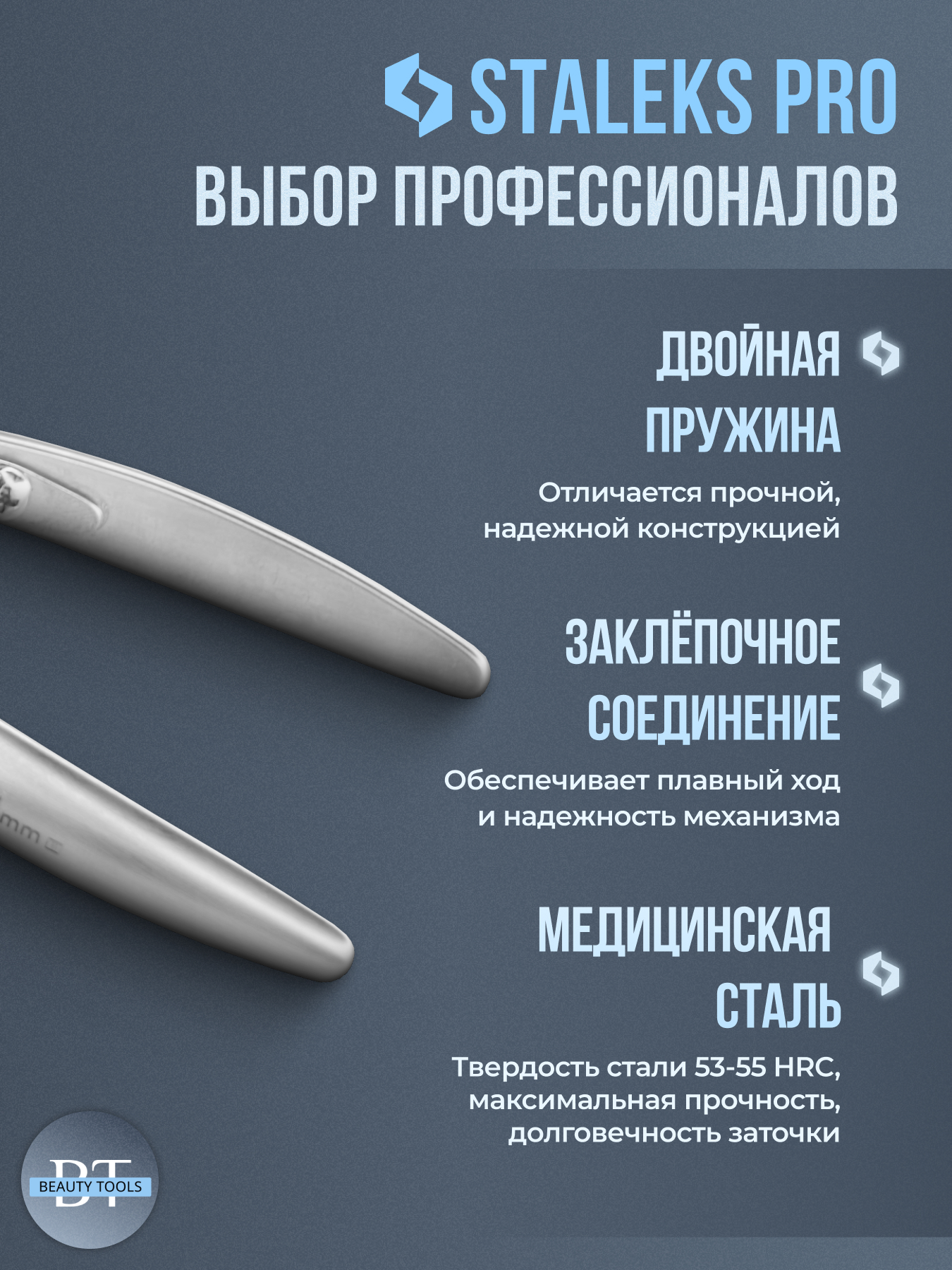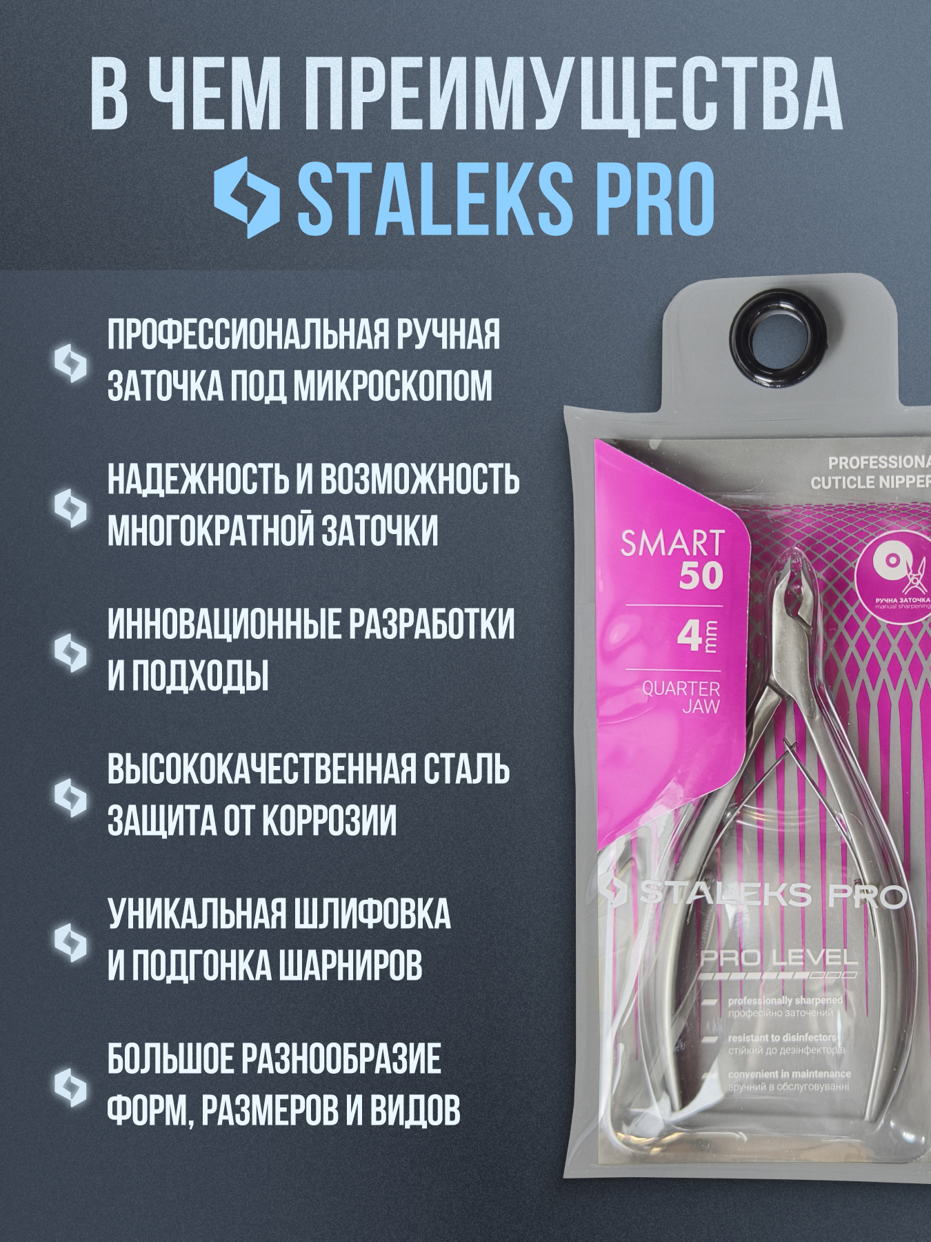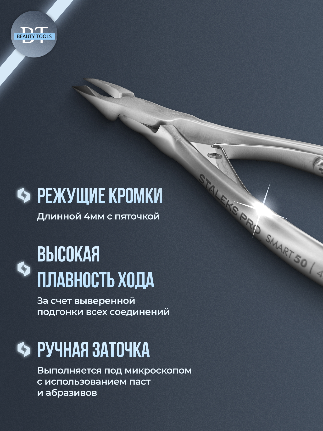 Кусачки для обработки кутикулы Smart изготовлены из высококачественной нержавеющей стали, которая длительное время не подвергается коррозии и выдерживает многократные заточки. Инструмент с двойным типом пружины и длиной режущей кромки 4 мм устойчив ко всем видам дезинфекции и стерилизации.