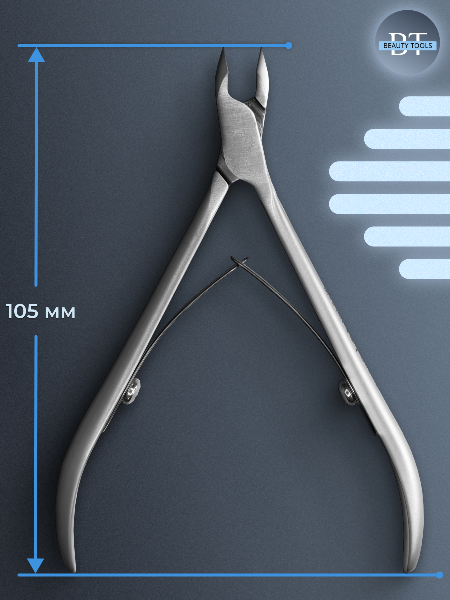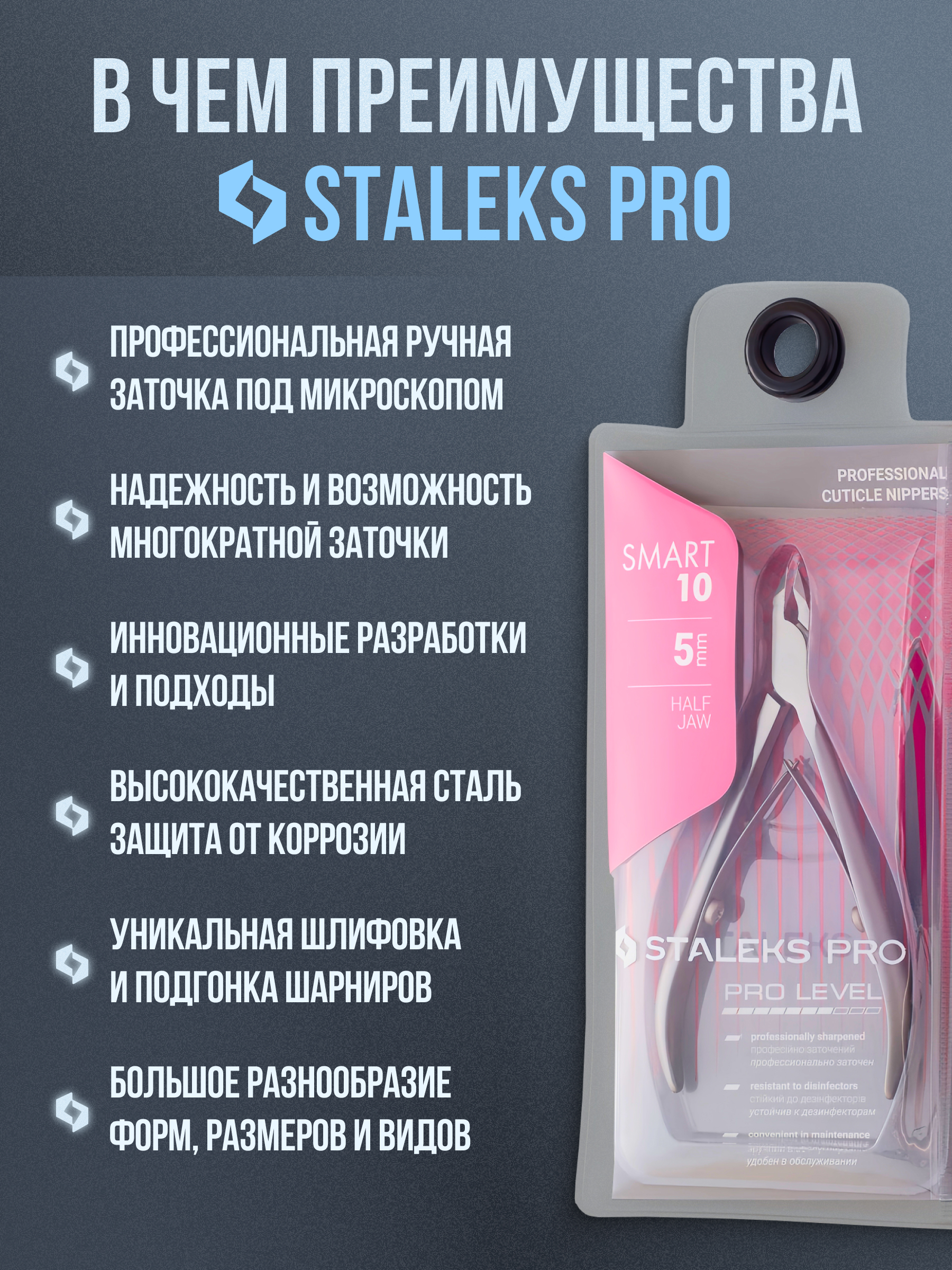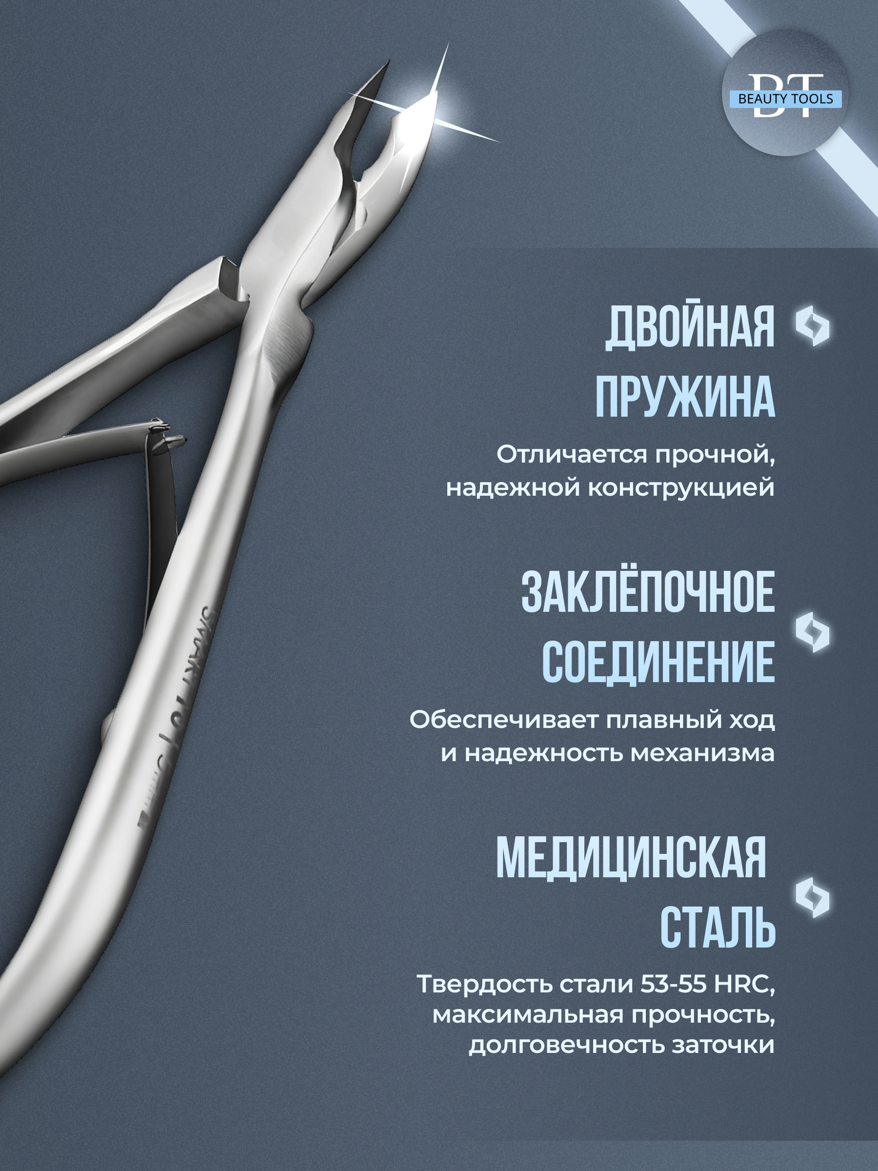 Кусачки для обработки кутикулы и ногтей Smart изготовлены из высококачественной нержавеющей стали, которая длительное время не подвергается коррозии и выдерживает многократные заточки. Инструмент со спиральным типом пружины и длиной режущей кромки 4 мм, устойчив ко всем видам дезинфекции и стерилизации.
