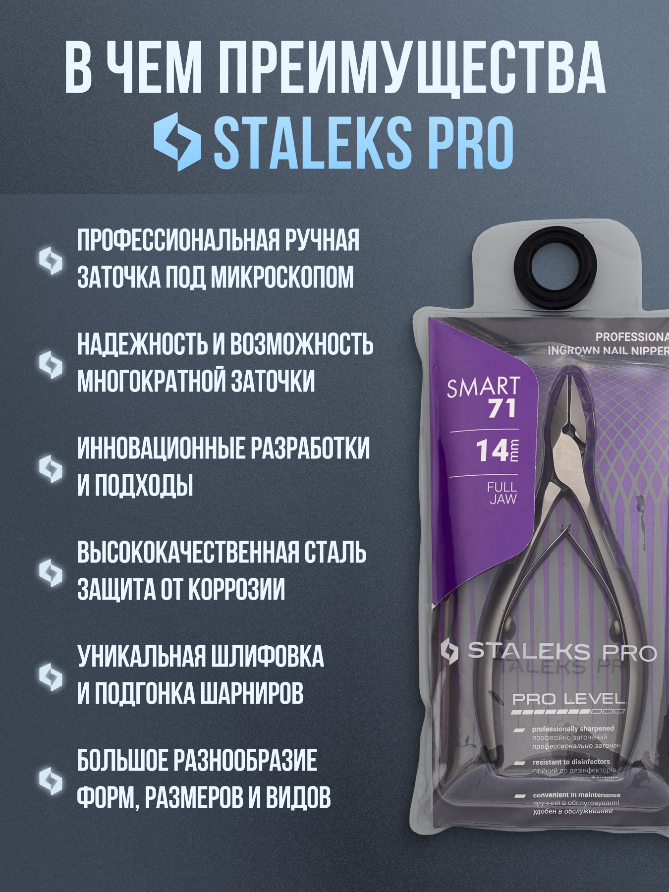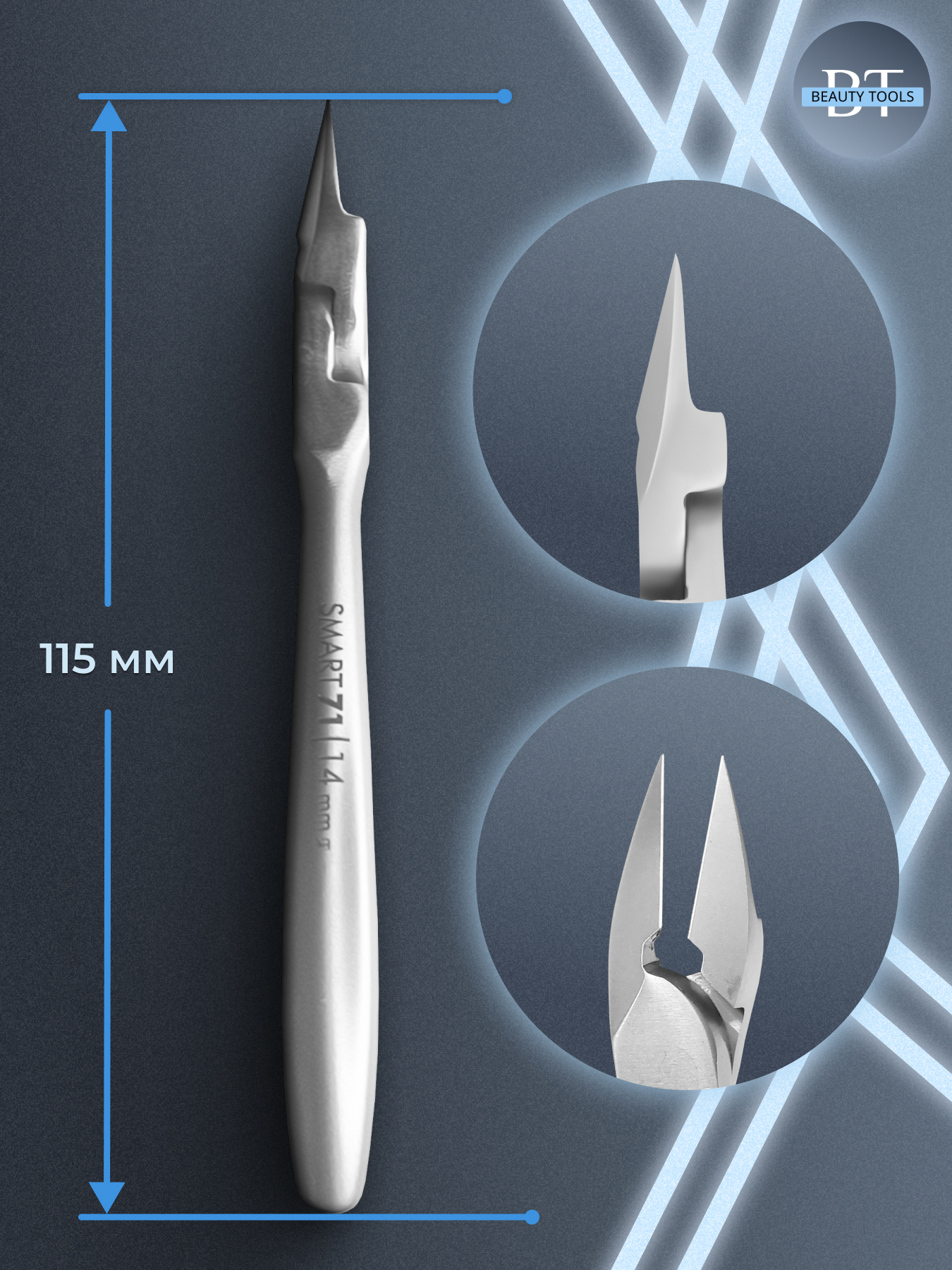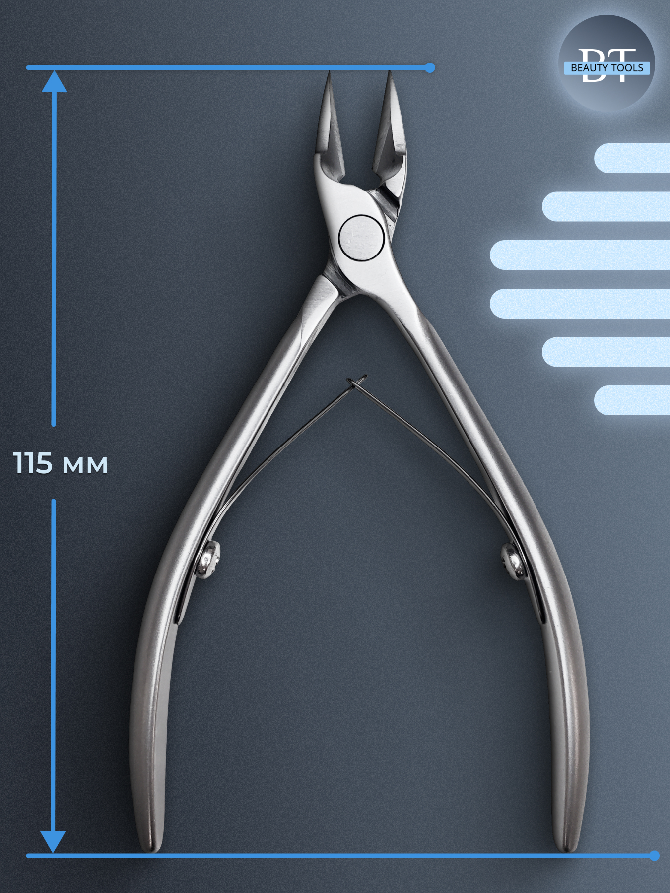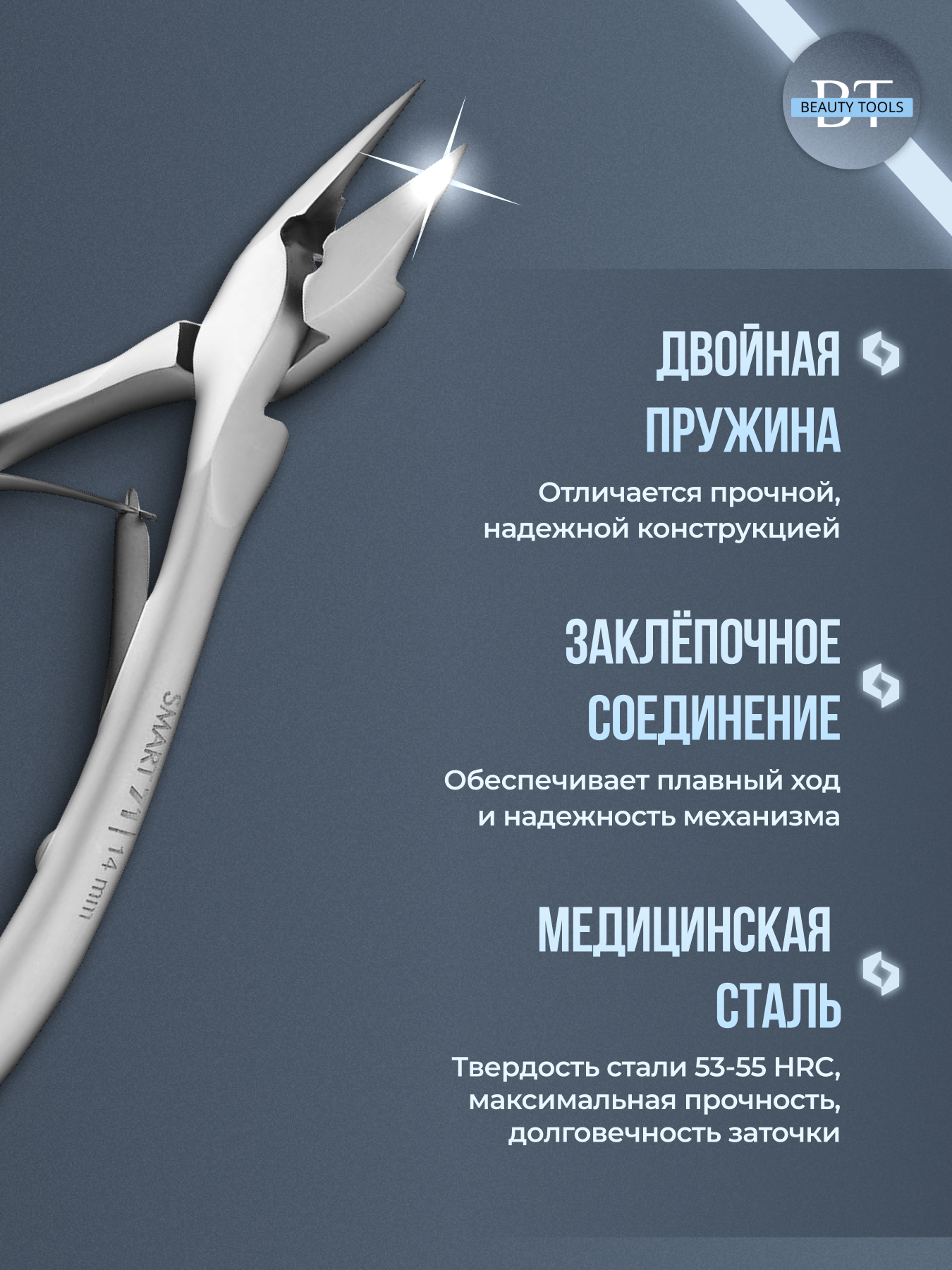 Кусачки для ногтя Smart изготовлены из высококачественной нержавеющей стали, которая длительное время не подвергается коррозии и выдерживает многократные заточки. Инструмент с двойным типом пружины и длиной режущей кромки 14 мм устойчив ко всем видам дезинфекции и стерилизации.
