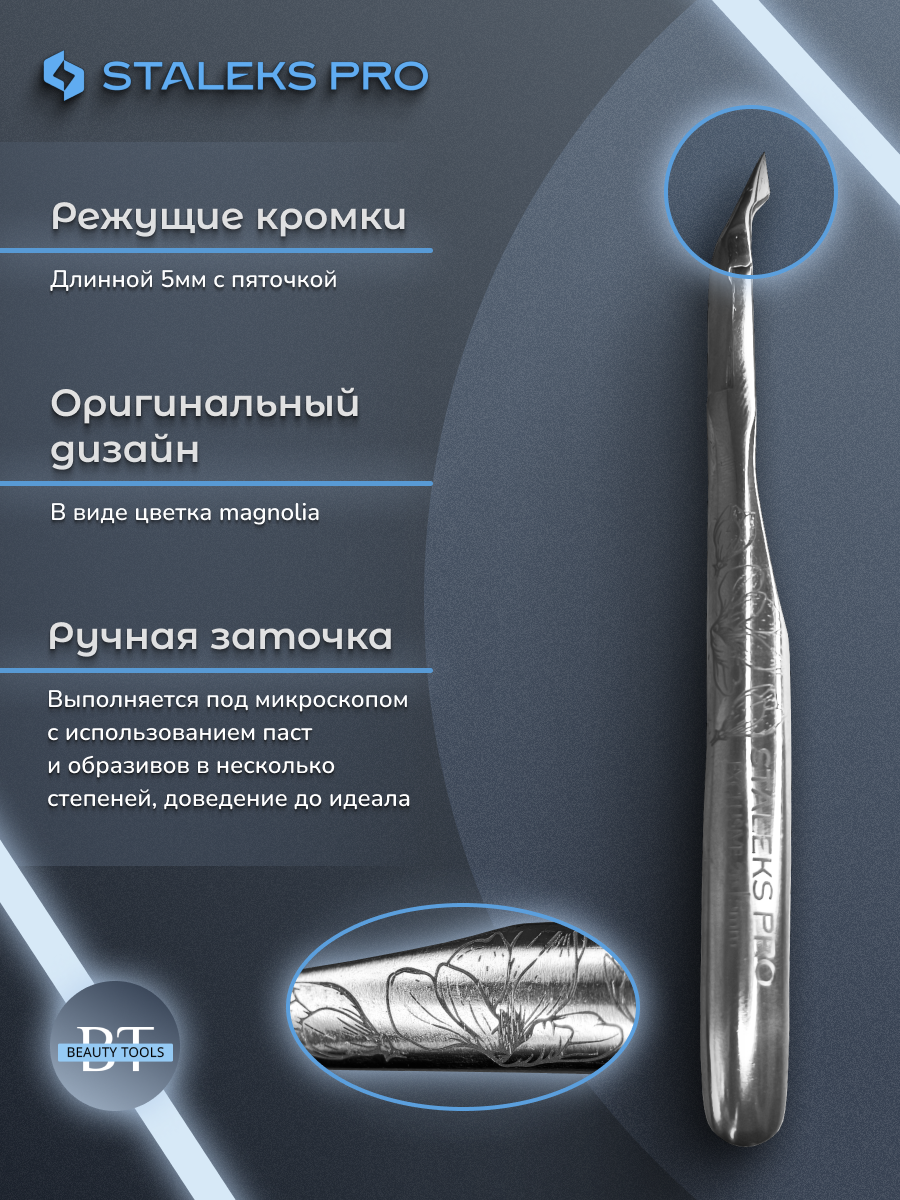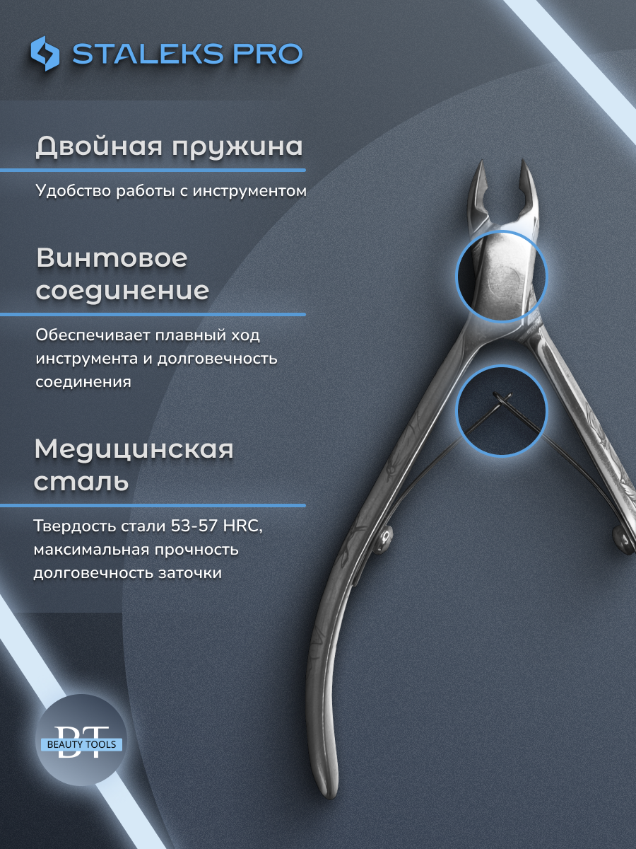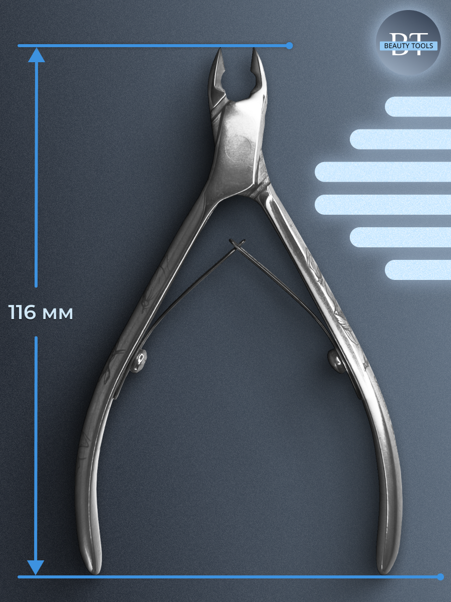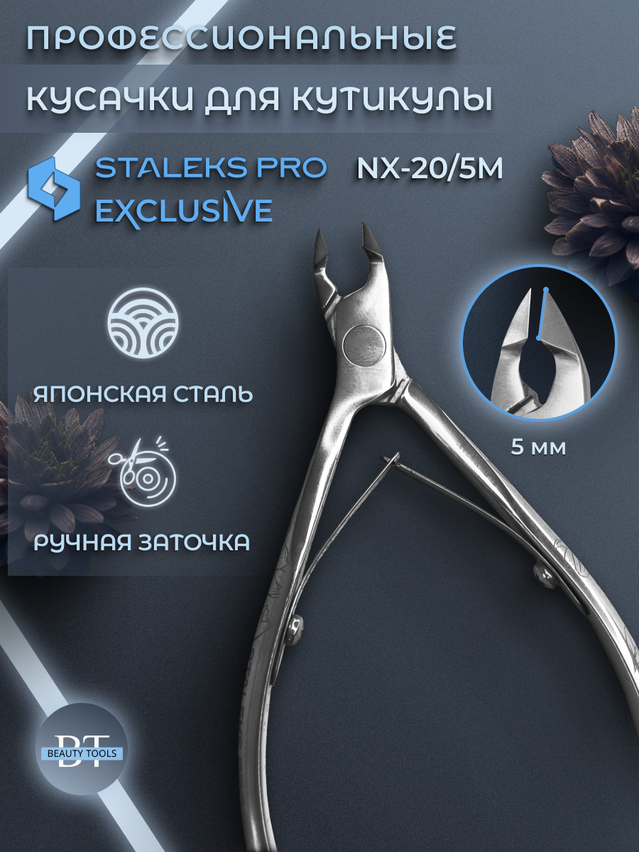 Кусачки для обработки кутикулы Exclusive изготовлены из высококачественной нержавеющей стали, которая длительное время не подвергается коррозии и выдерживает многократные заточки. Инструмент с двойным типом пружины и длиной режущей кромки 5 мм устойчив ко всем видам дезинфекции и стерилизации.