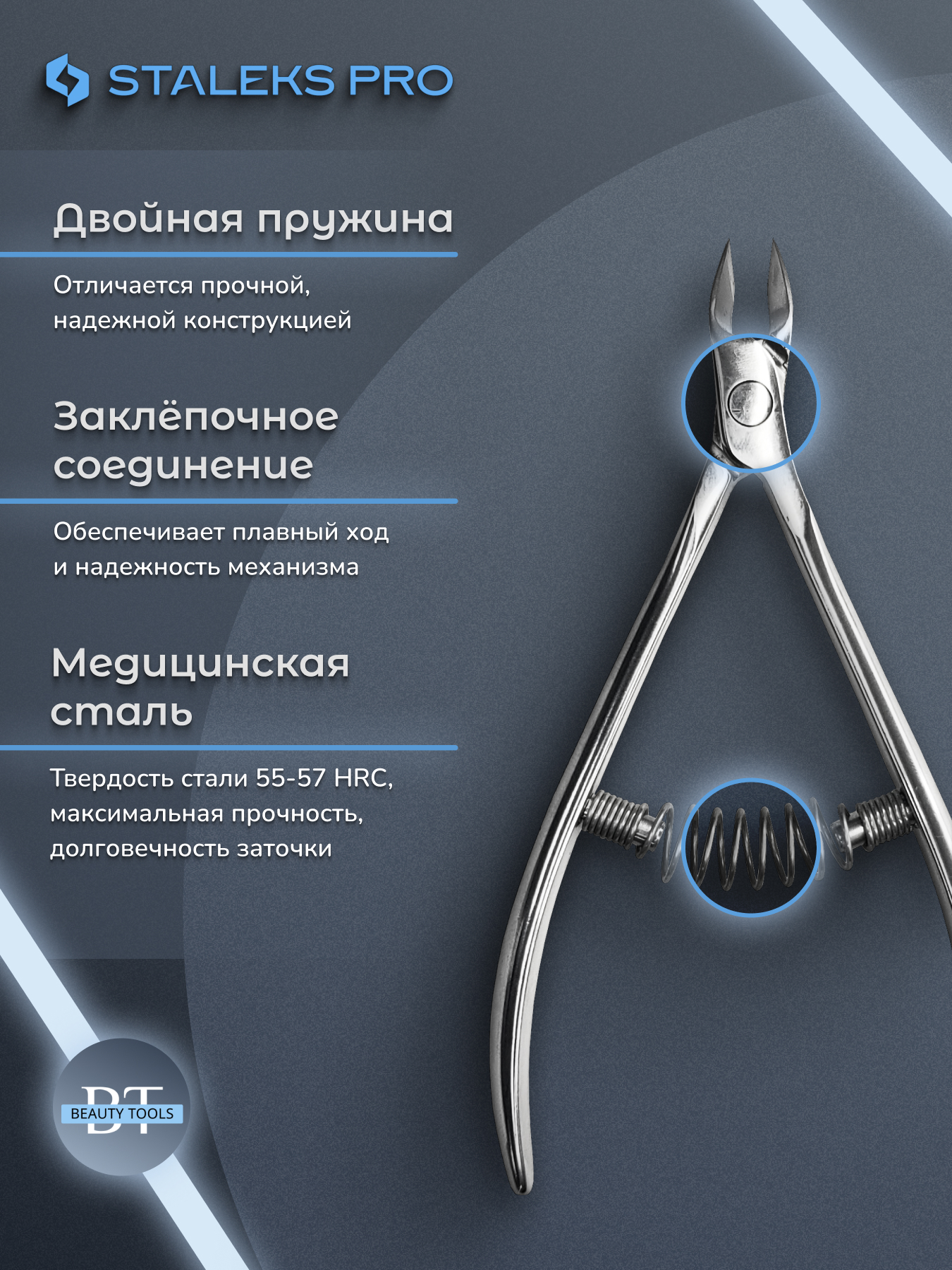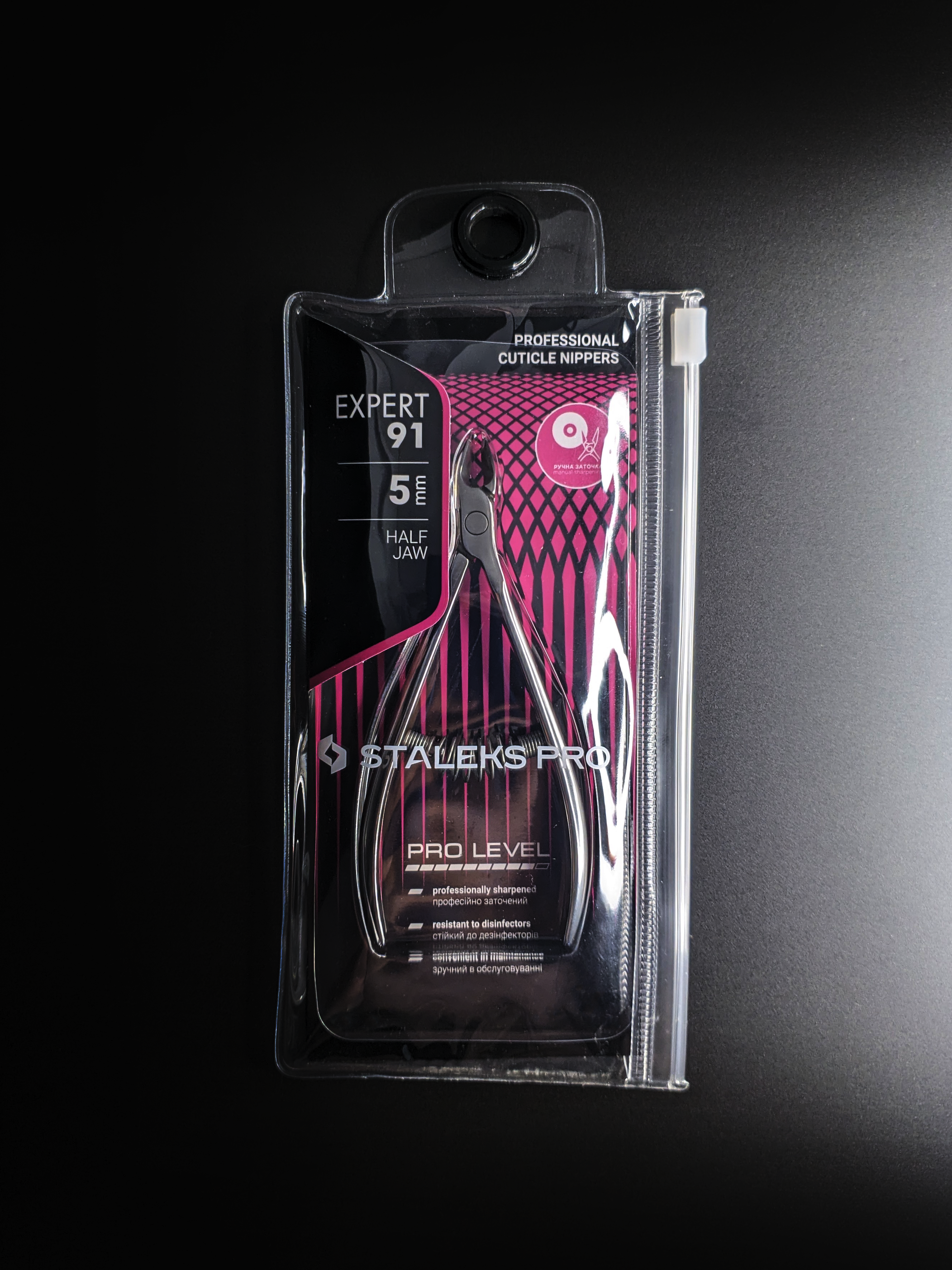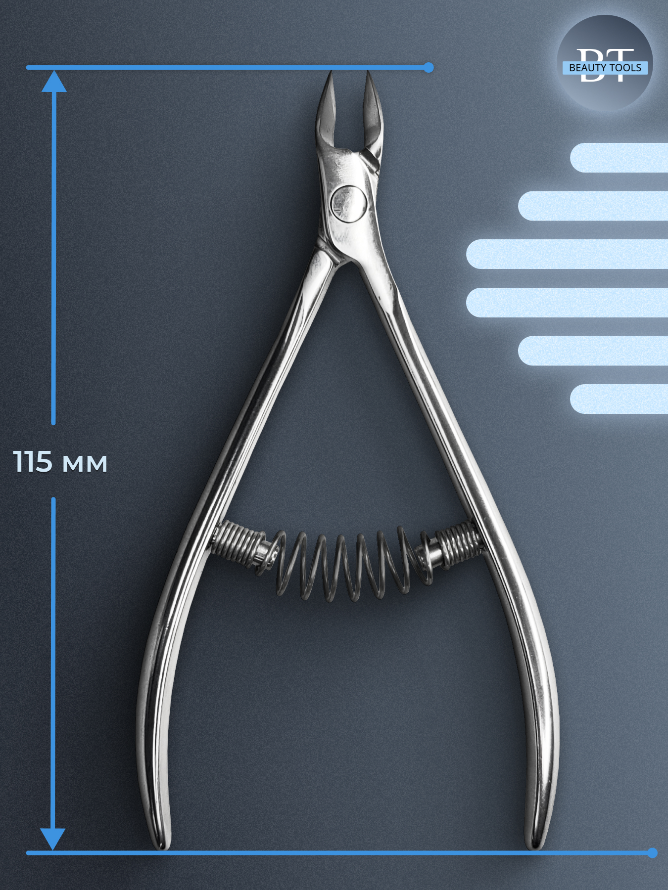 Кусачки для обработки кутикулы Expert изготовлены из высококачественной нержавеющей стали, которая длительное время не подвергается коррозии и выдерживает многократные заточки. Инструмент со спиральным типом пружины и длиной режущей кромки 5 мм устойчив ко всем видам дезинфекции и стерилизации.