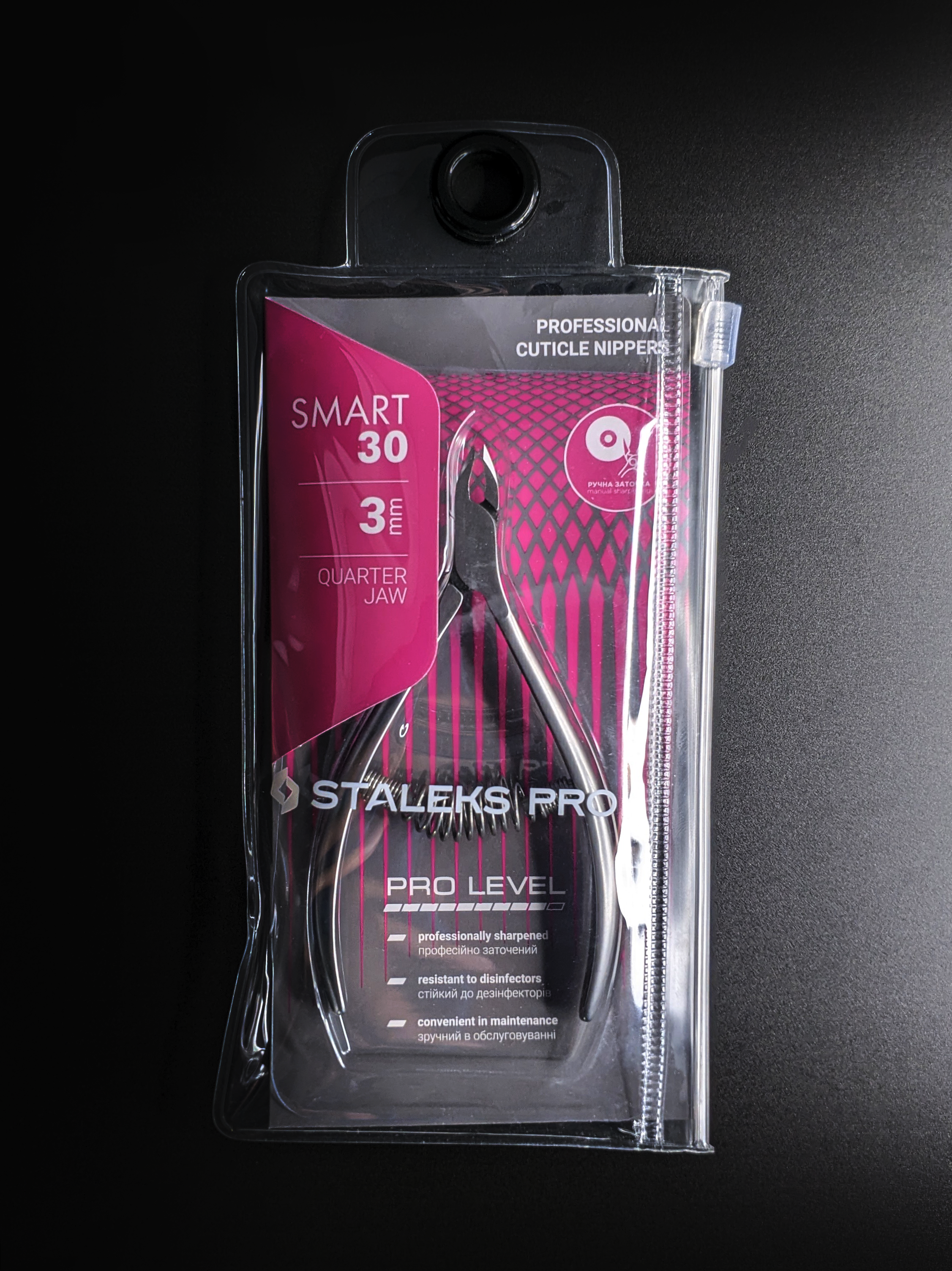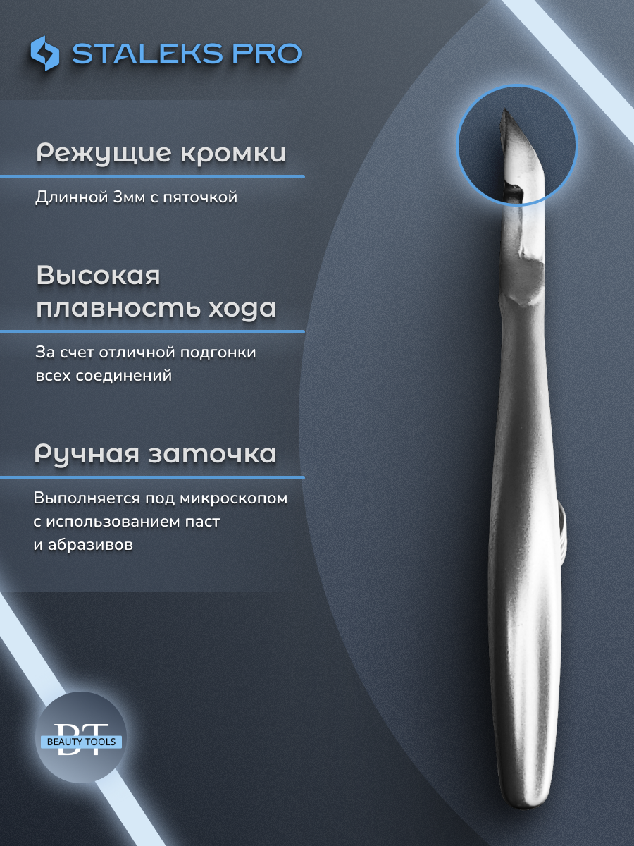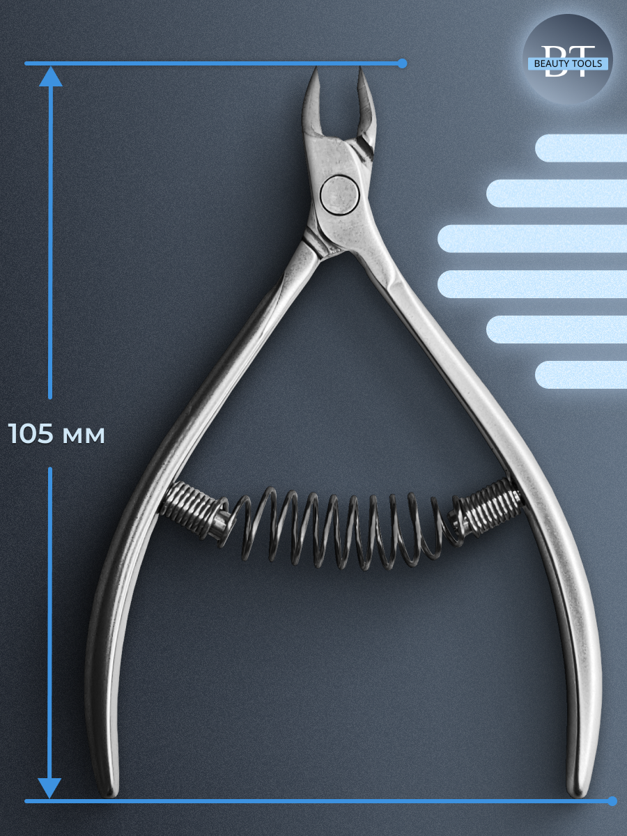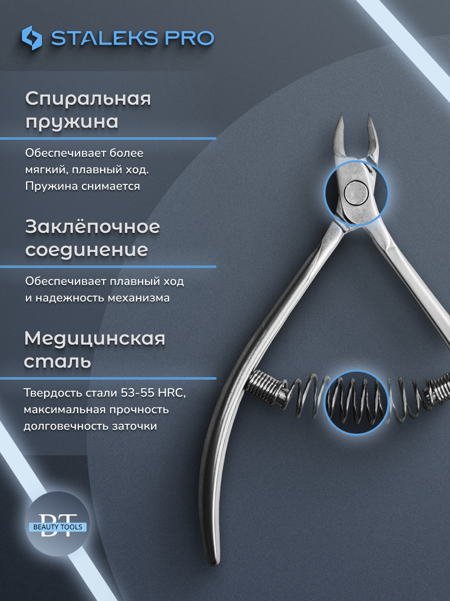 Кусачки для обработки кутикулы Smart изготовлены из высококачественной нержавеющей стали, которая длительное время не подвергается коррозии и выдерживает многократные заточки. Инструмент со спиральным типом пружины и длиной режущей кромки 3 мм устойчив ко всем видам дезинфекции и стерилизации.