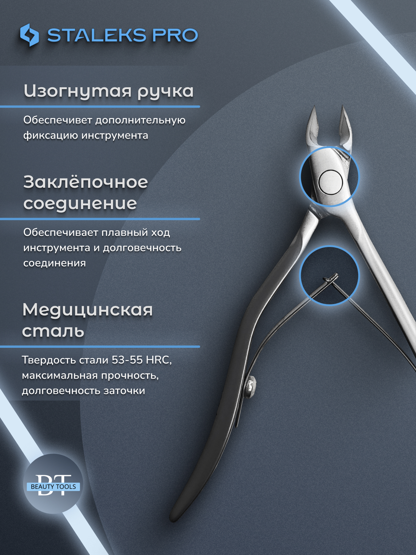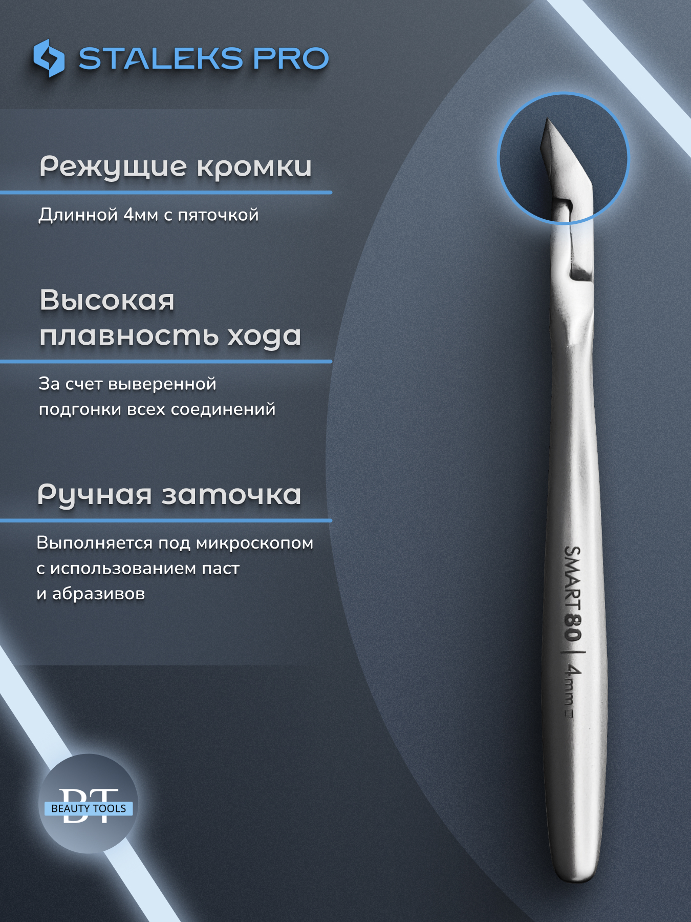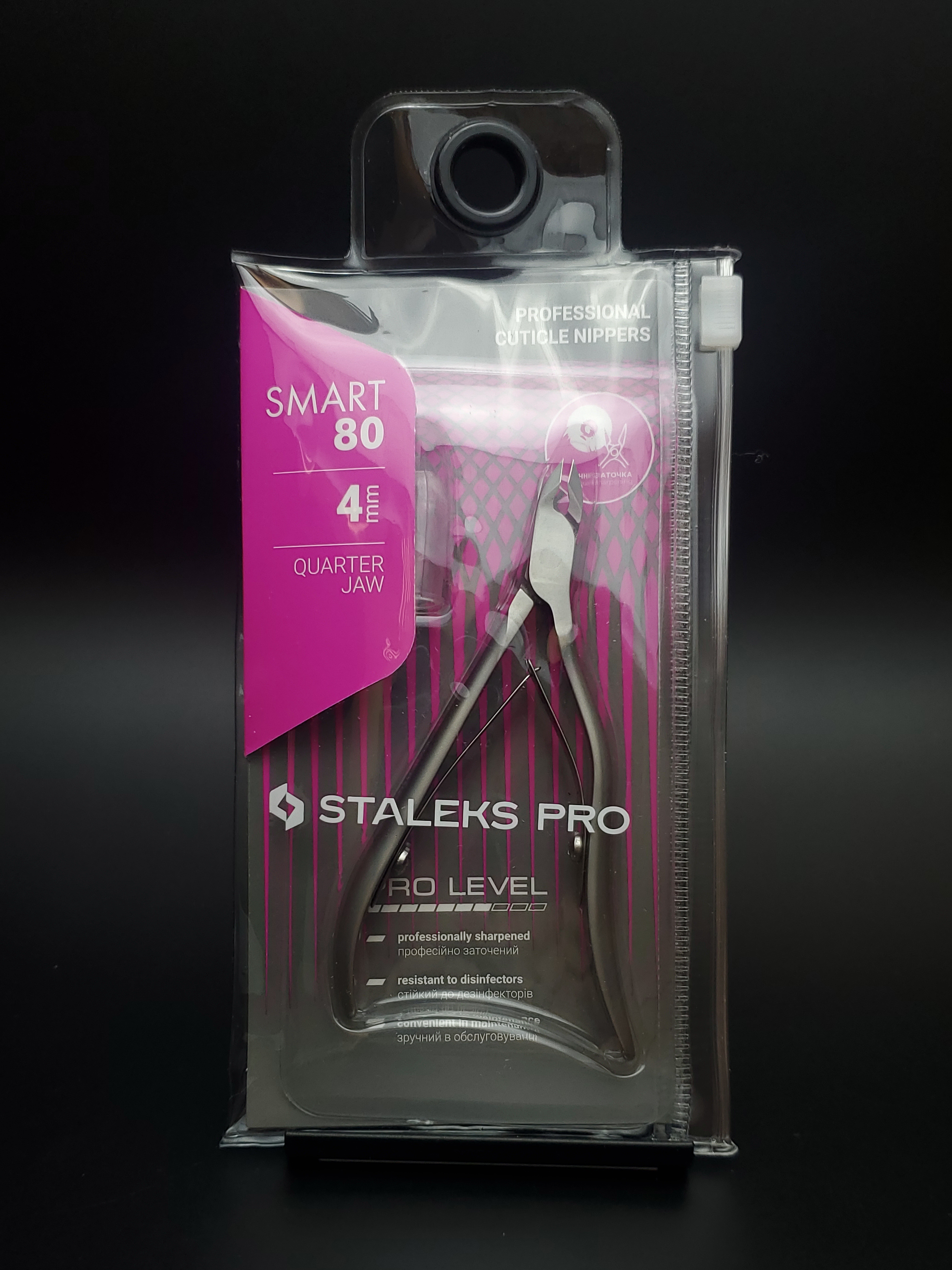 Кусачки для обработки кутикулы Smart изготовлены из высококачественной нержавеющей стали, которая длительное время не подвергается коррозии и выдерживает многократные заточки. Инструмент с двойным типом пружины и длиной режущей кромки 4 мм устойчив ко всем видам дезинфекции и стерилизации.