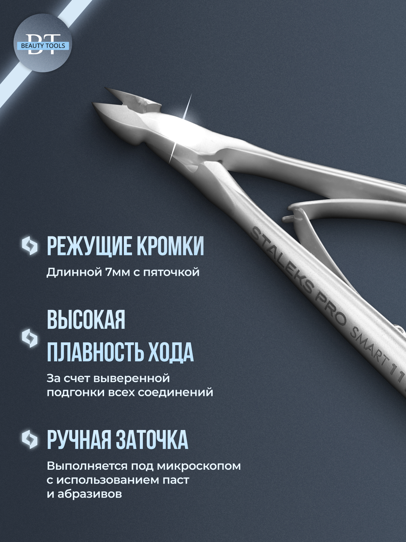 Кусачки для обработки кутикулы Smart изготовлены из высококачественной нержавеющей стали, которая длительное время не подвергается коррозии и выдерживает многократные заточки. Инструмент с двойным типом пружины и длиной режущей кромки 7 мм устойчив ко всем видам дезинфекции и стерилизации.