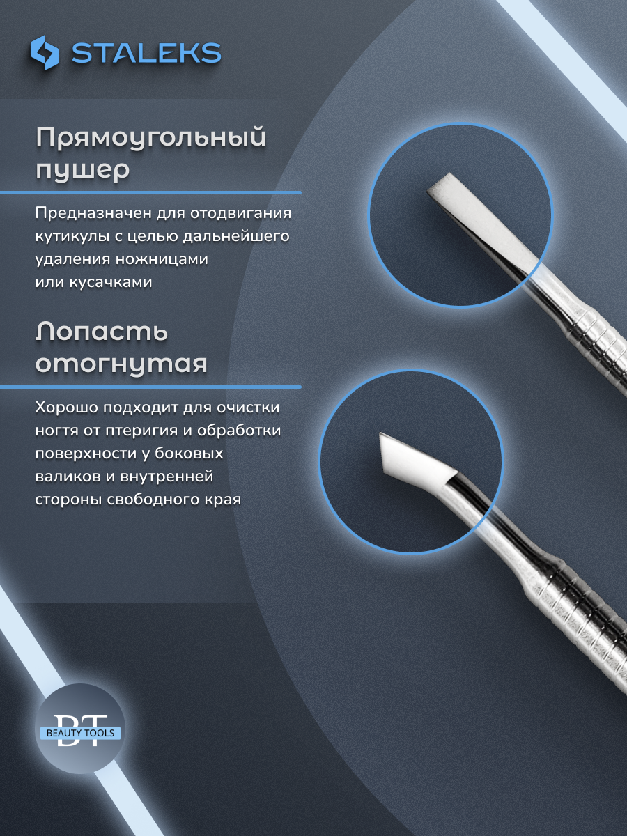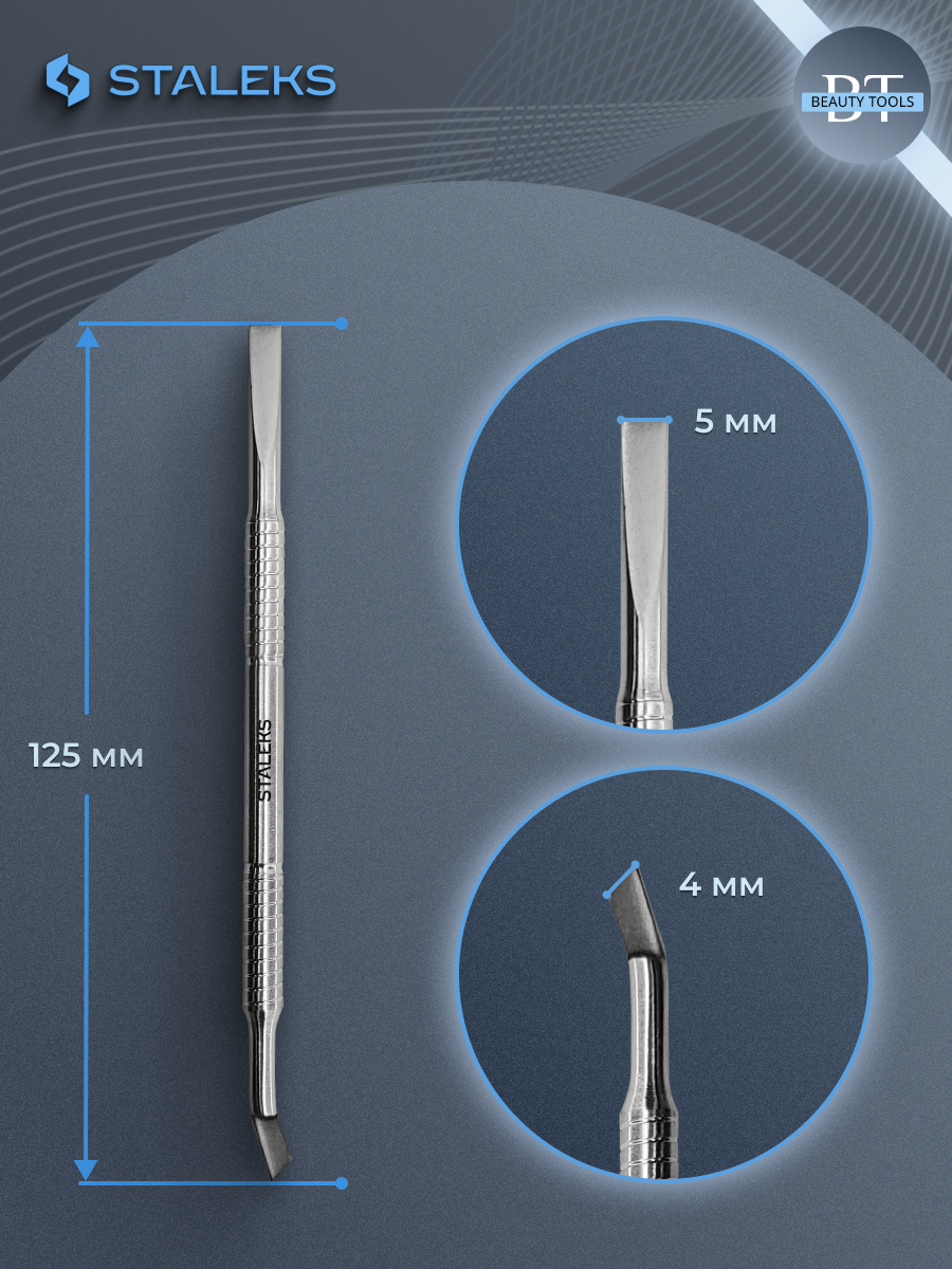 Маникюрная лопатка BEAUTY & CARE 40 TYPE 1 с двумя рабочими частями. С одной стороны, «прямоугольный пушер», предназначенный для поднятия и отодвигания кутикулы, с другой стороны «отогнутая лопасть», которая применяется для очищения ногтевой пластины от птеригия. Инструмент изготовлен из нержавеющей стали, поддаётся всем видам дезинфекции и стерилизации.