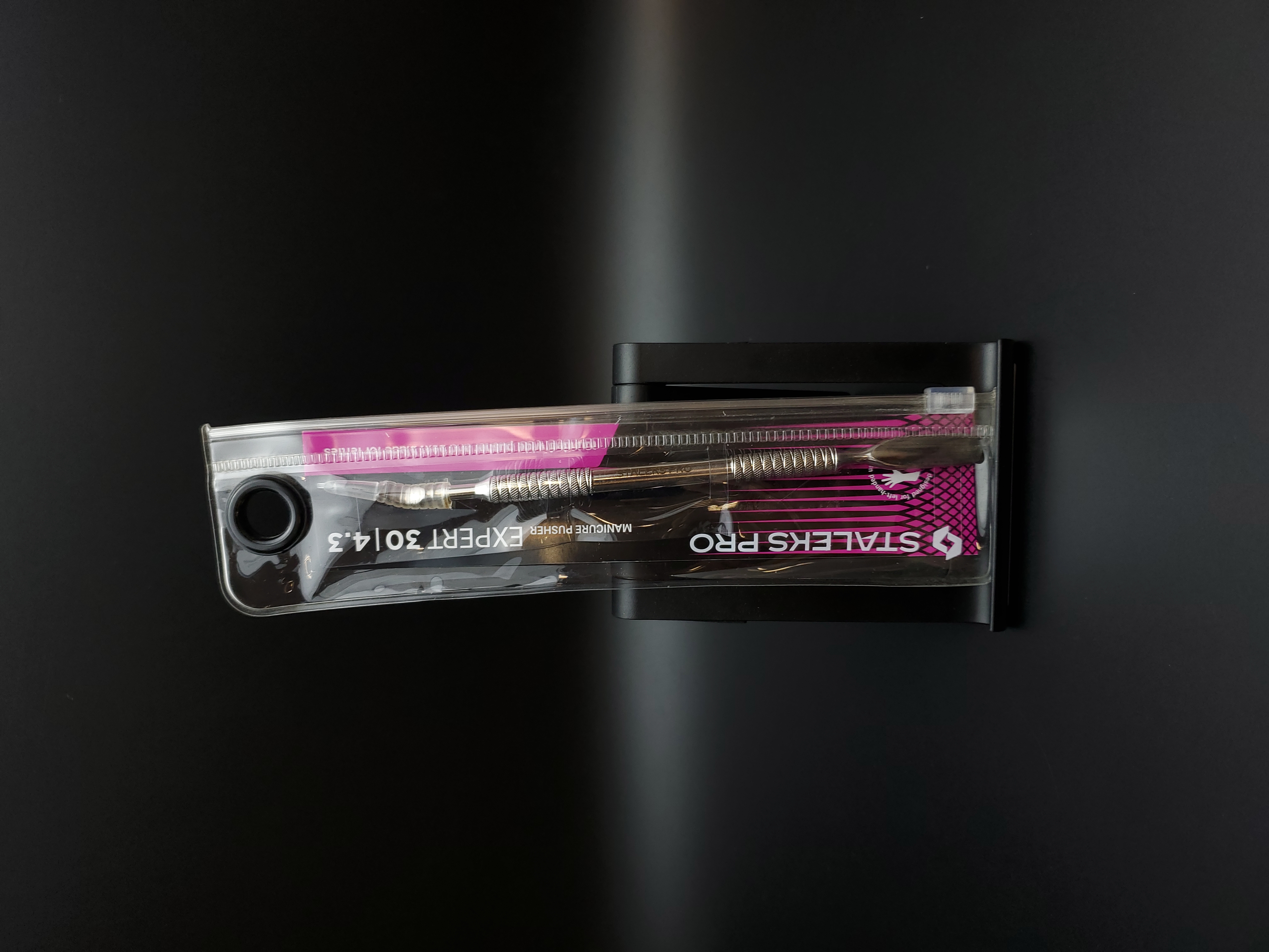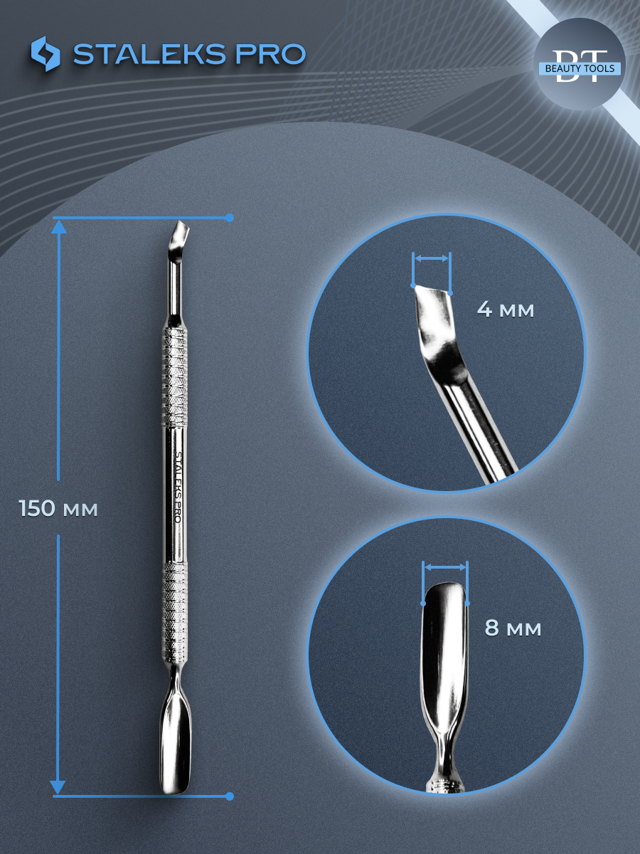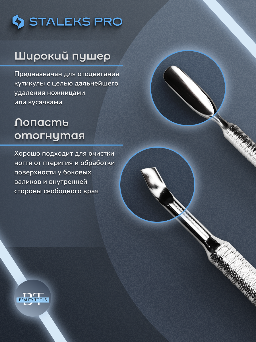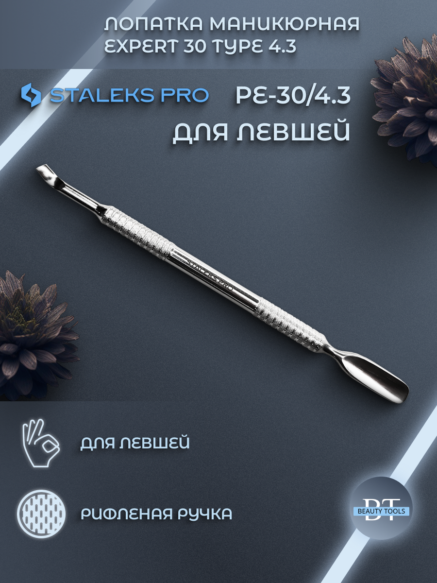 Маникюрная лопатка с двумя рабочими частями для левши. «Скруглённый широкий пушер» предназначен для поднятия и отодвигания грубой кутикулы, а «отогнутая лопасть» для очищения ногтевой пластины от птеригия. Инструмент изготовлен из нержавеющей стали, поддаётся всем видам дезинфекции и стерилизации.