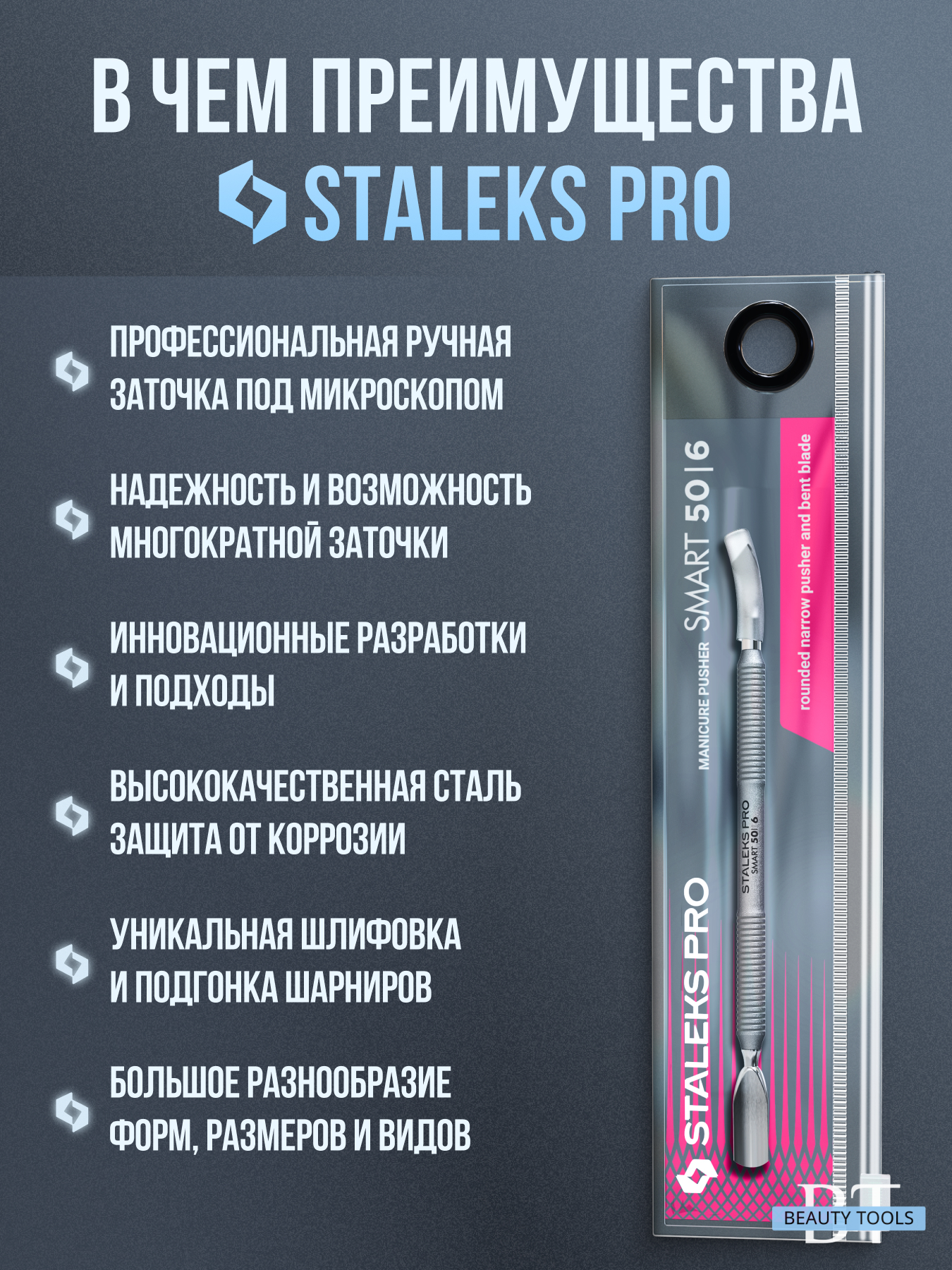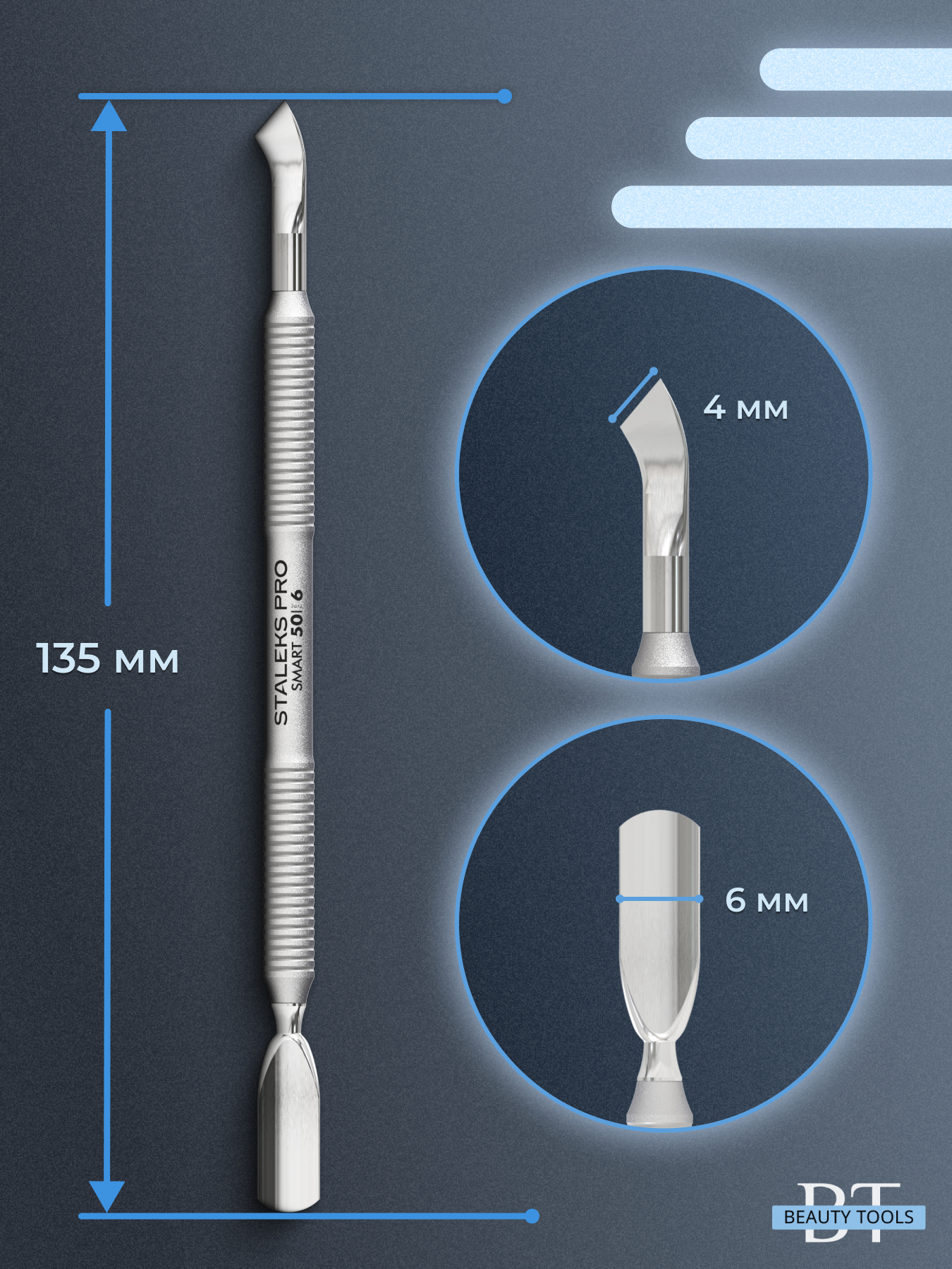 Маникюрная лопатка SMART 50 TYPE 6 с двумя рабочими частями. «Скруглённый пушер» предназначен для поднятия и отодвигания кутикулы, а «отогнутая лопасть» применяется для очищения ногтевой пластины от грубой кутикулы. Инструмент изготовлен из нержавеющей стали, поддаётся всем видам дезинфекции и стерилизации.