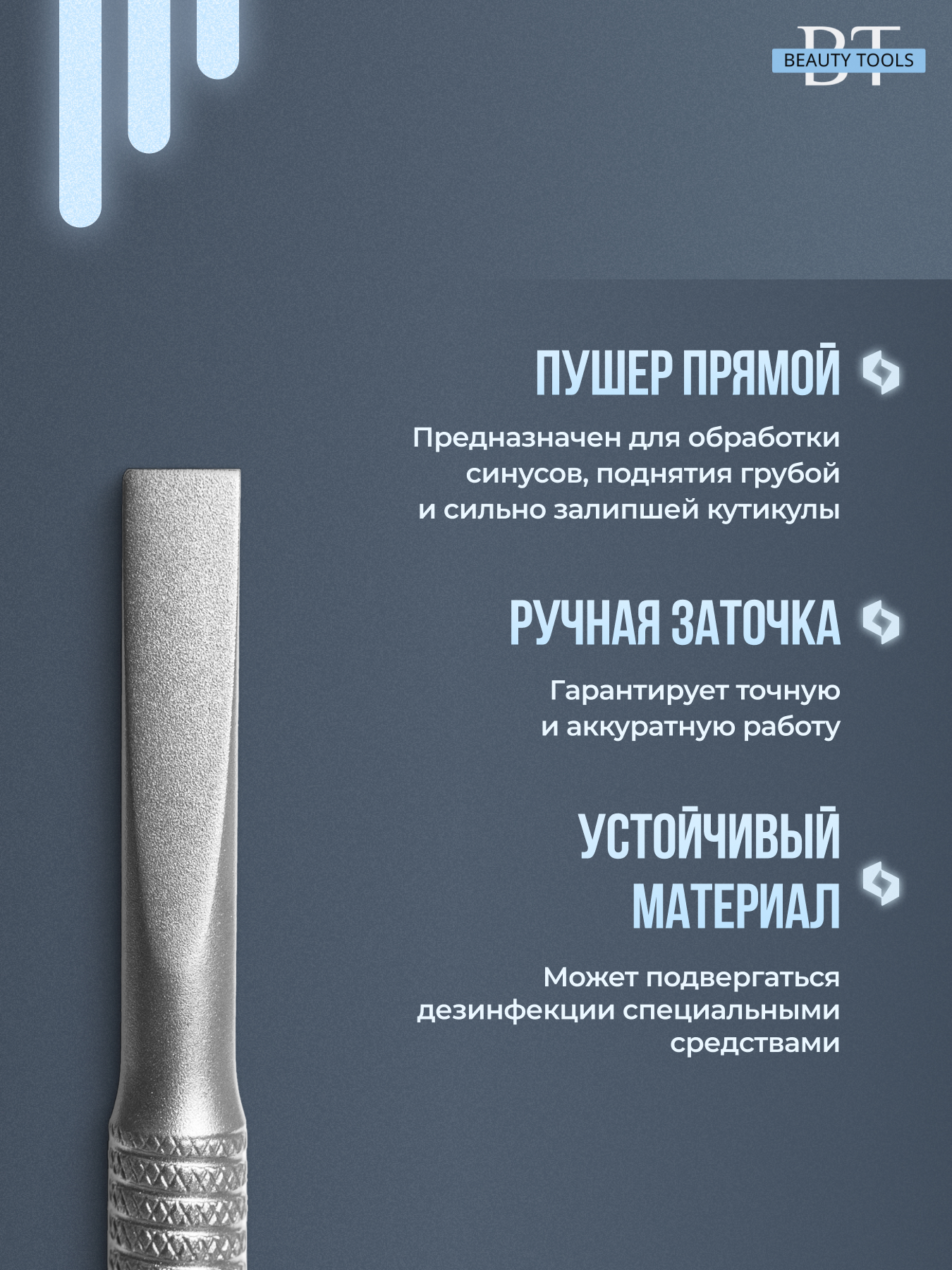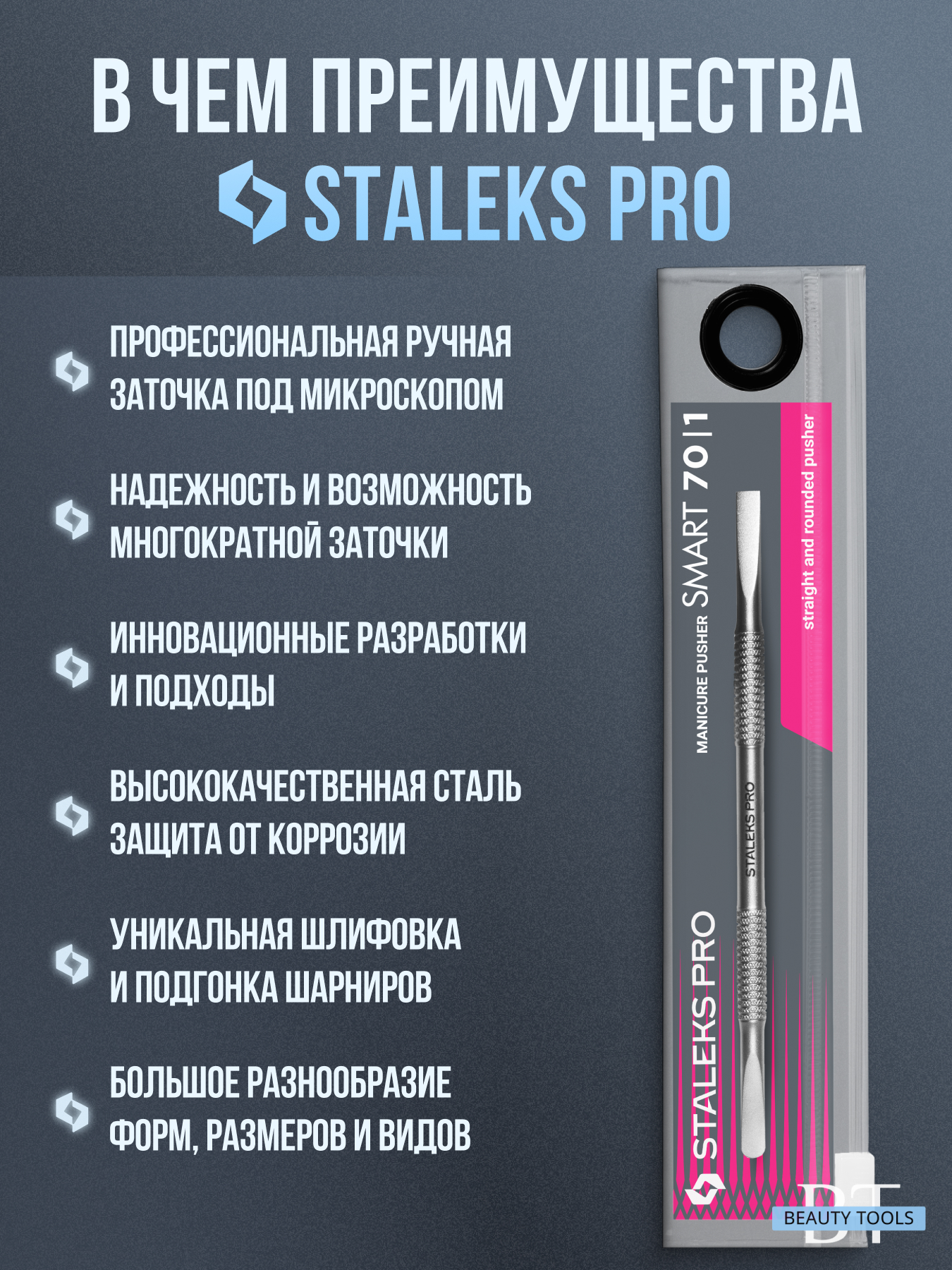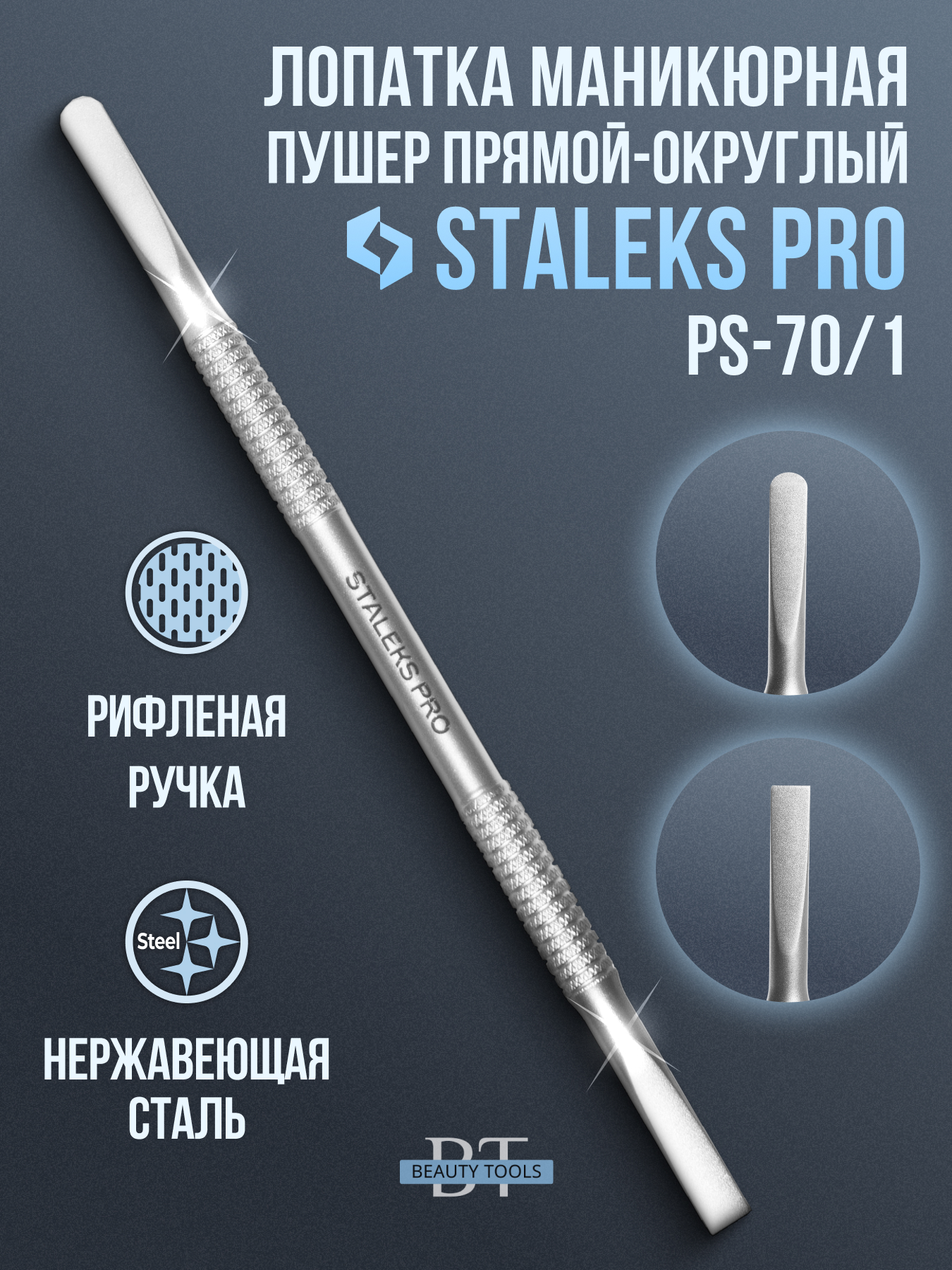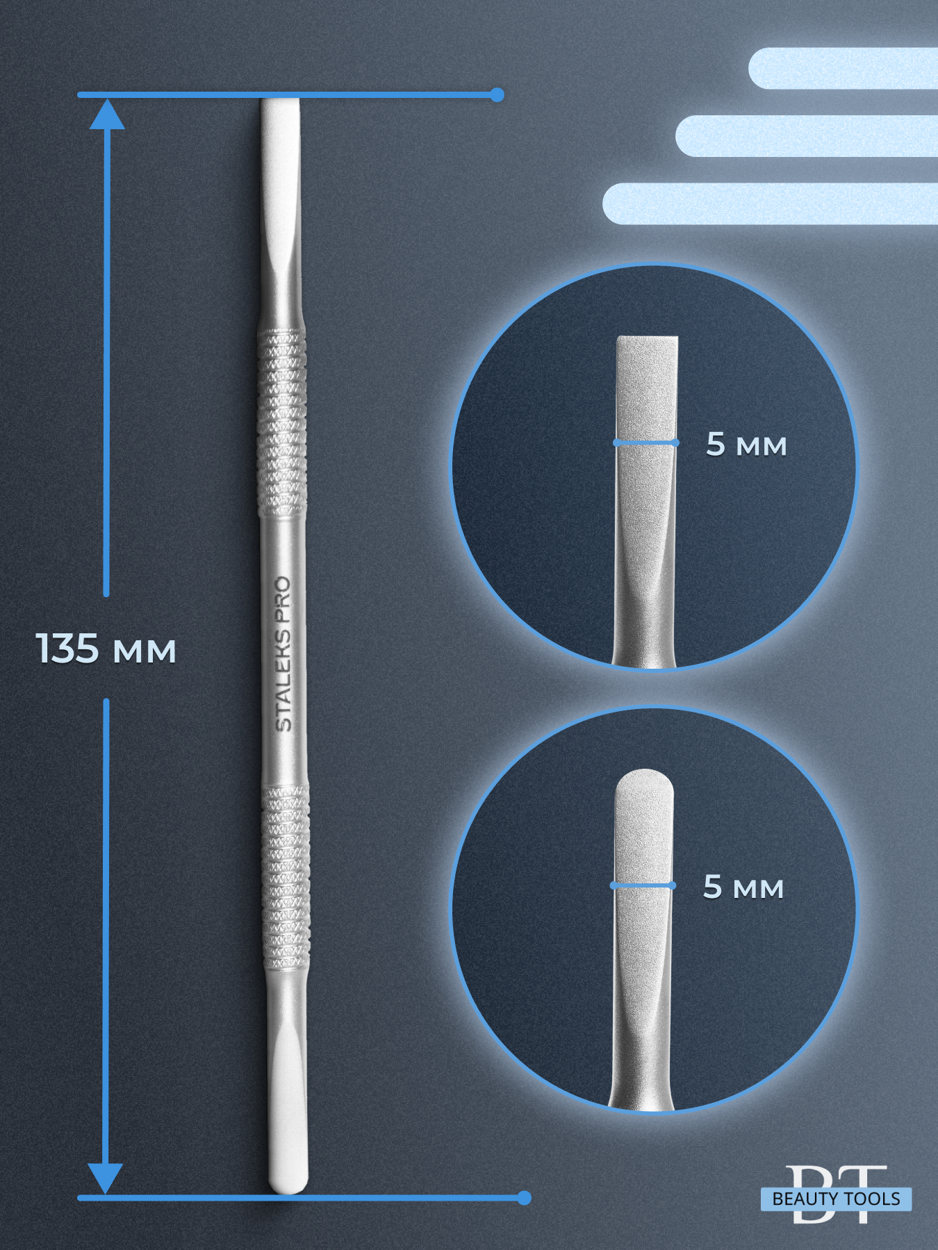 Маникюрная лопатка SMART 70 TYPE 1 с двумя рабочими частями. «Пушер с прямым концом» предназначен для поднятия и отодвигания кутикулы, «округлый пушер» также подходит для обработки кутикулы, но за счёт скруглённой формы плотнее прилегает к ногтевой пластине. Инструмент изготовлен из нержавеющей стали, поддаётся всем видам дезинфекции и стерилизации.