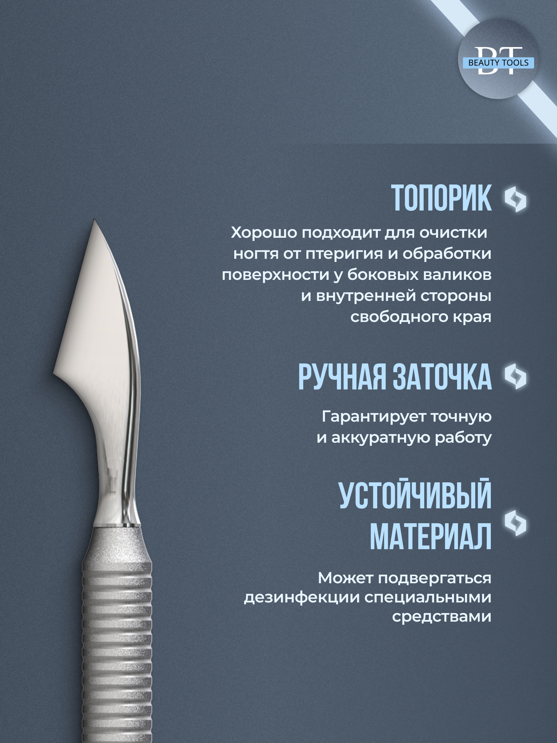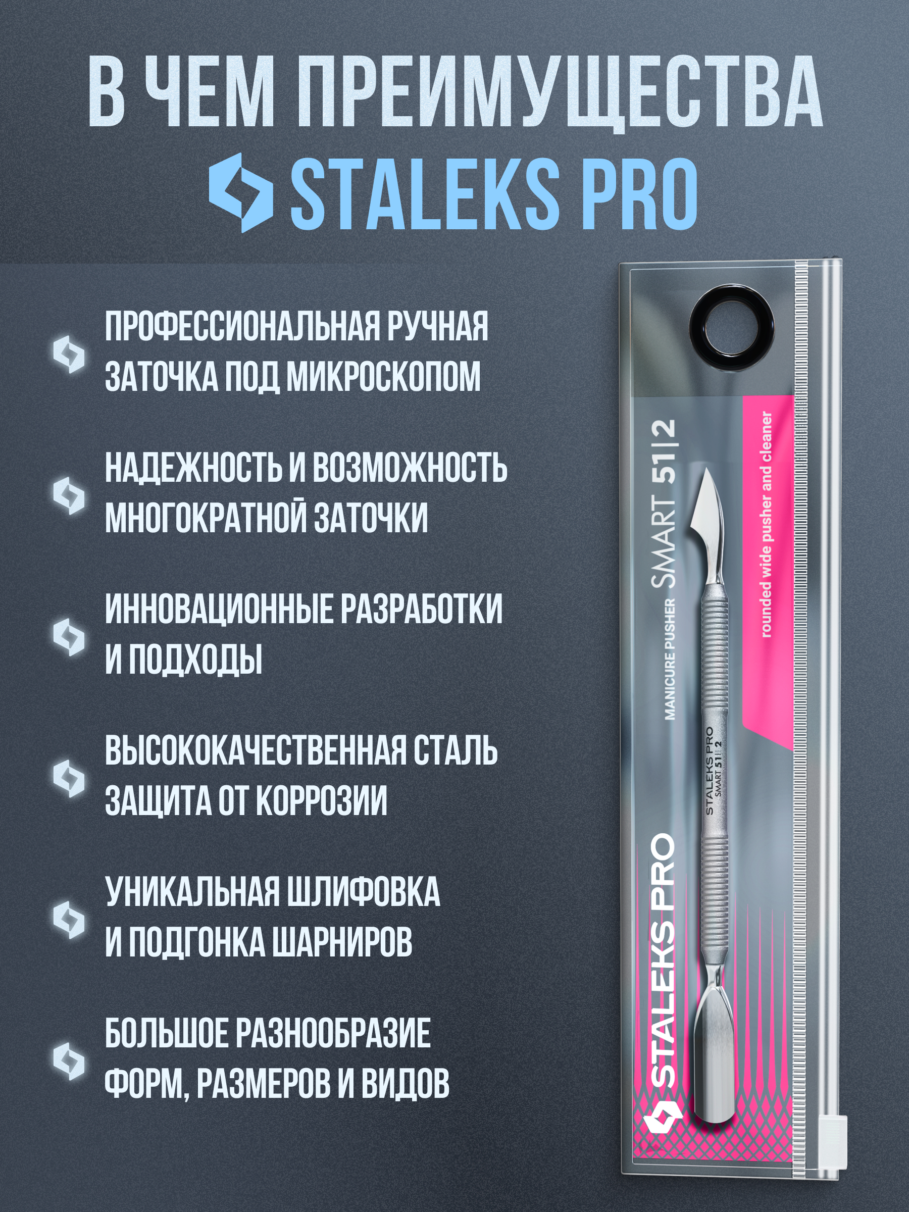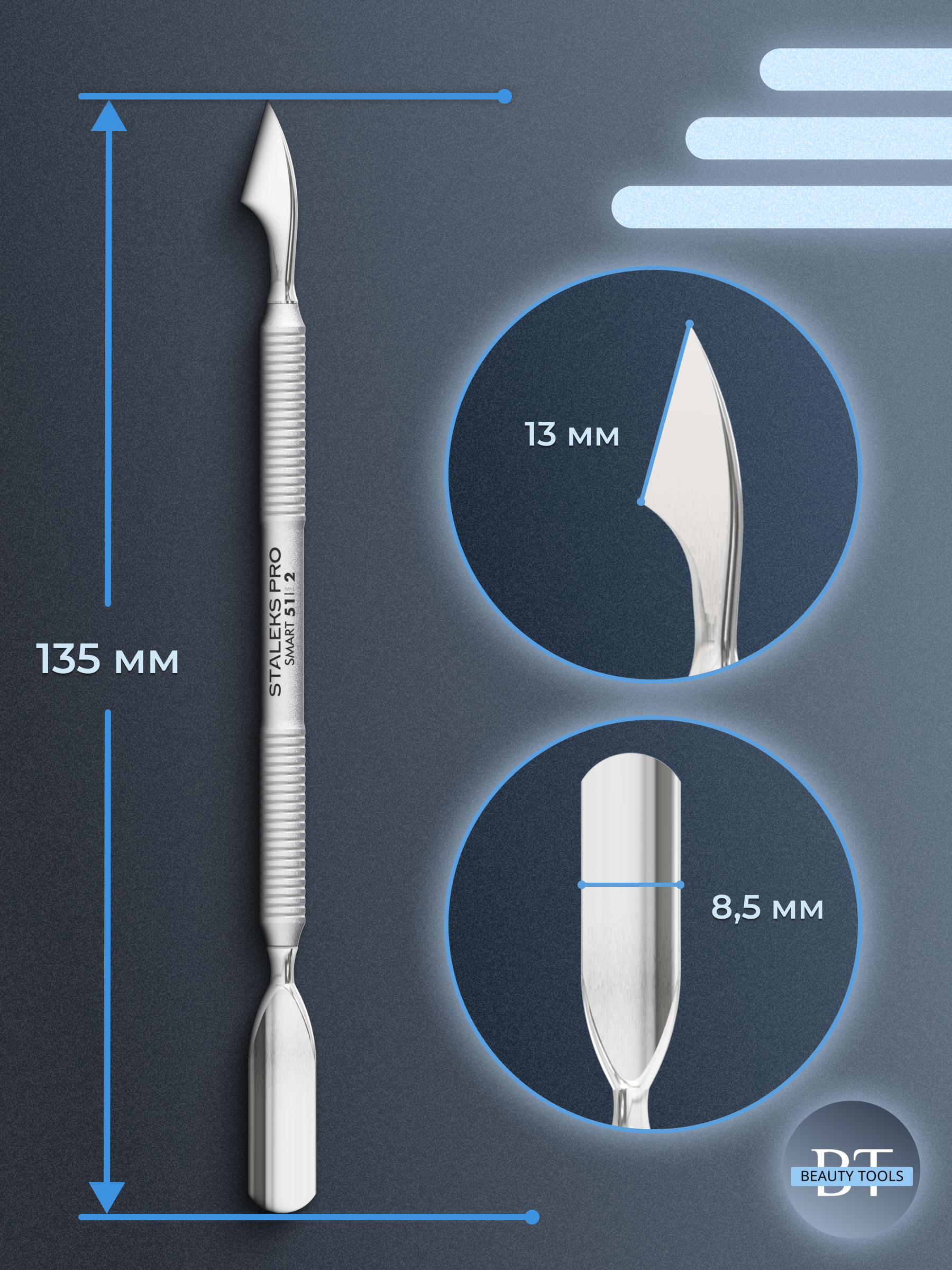 Маникюрная лопатка SMART 51 TYPE 2 с двумя рабочими частями. «Пушер округлый с прямым концом» предназначен для поднятия и отодвигания кутикулы, а «топорик» за счёт ручной двусторонней заточки эффективно очищает ногтевую пластину от наростов кожи. Инструмент изготовлен из нержавеющей стали, поддаётся всем видам дезинфекции и стерилизации.