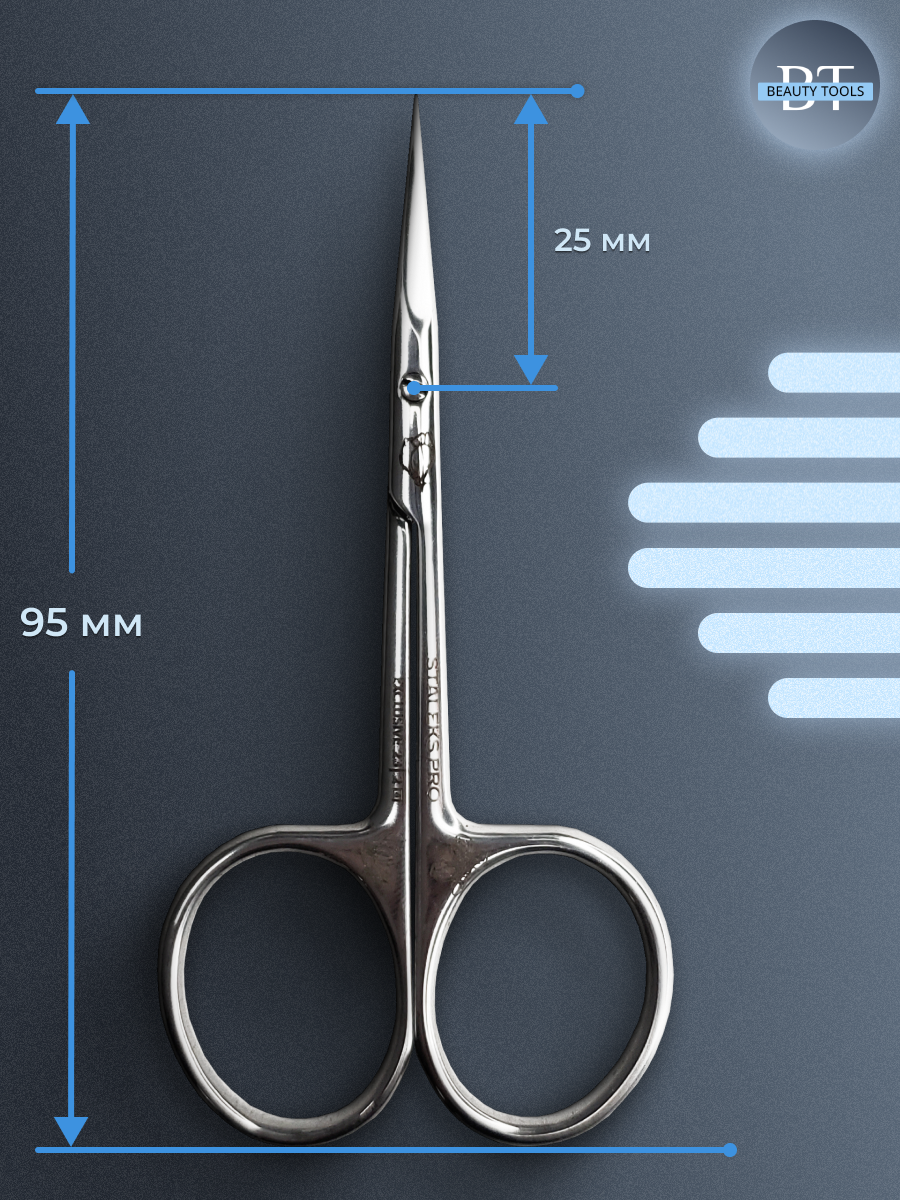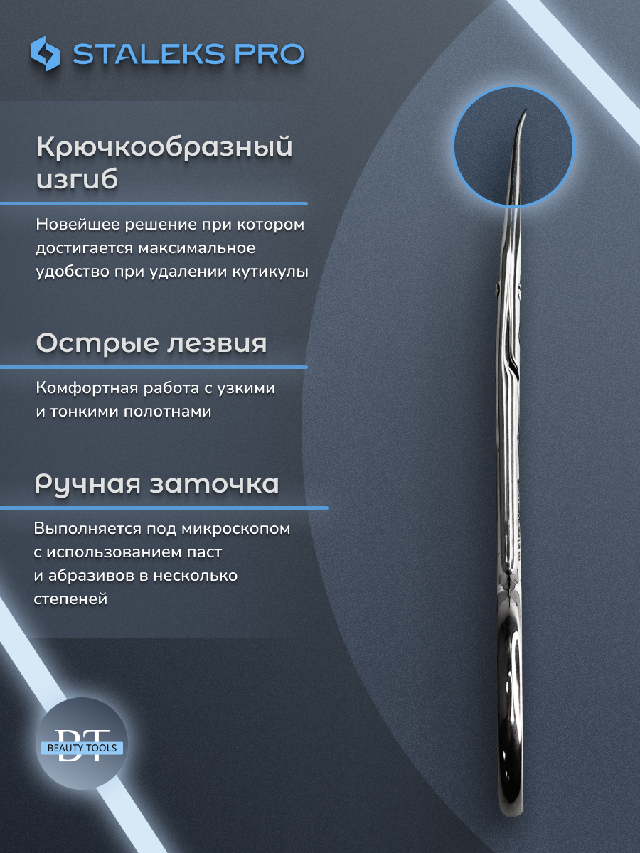 Профессиональные ножницы Staleks Pro серия EXCLUSIVE 23 Type 2, для обработки кутикулы. Инструменты серии эксклюзив созданы для профессионалов и опытных мастеров маникюрной индустрии. Высококлассные ножницы премиум класса выполнены из нержавеющей стали класса AISI 420, особо прочный сплав устойчив к коррозии и царапинам. Так же каждые ножницы серии проходят через ручную полировку постой ГОИ до зеркального блеска. Уникальная полировка шарнира и радиусная выборка инструмента снижает трения лезвий друг о друга, что позволяет увеличить цикл работоспособности. Ножницы подлежат всем видам обработки: в стерилизаторе «сухожаре», дезинфицирующими средствами, антисептиком. Этап пассивации обеспечивает дополнительную коррозийную устойчивость. Специально разработана эргономичная форма не дает уставать руке при работе с инструментом. Ножницы заточены под микроскопом лучшими мастерами завода Сталекс. Каждый инструмент проходит проверку службы контроля качества, знак отличия вы можете увидеть на упаковке. Ножницы серии имеют классическую форму изгиба и крючкообразную. Крючкообразный изгиб - это фирменная разработка компании, он создан для более легкой обработки кутикулы специально под ее форму. Для выбора инструмента вы можете обратиться к нам с вопросом и наш менеджер поможет подобрать для вас идеально подходящий товар, для нас очень важна обратная связь с покупателями. Желаем Вам приятных покупок!!! Официальный дистрибьютер фирмы Staleks компания «BEAUTY TOOLS».