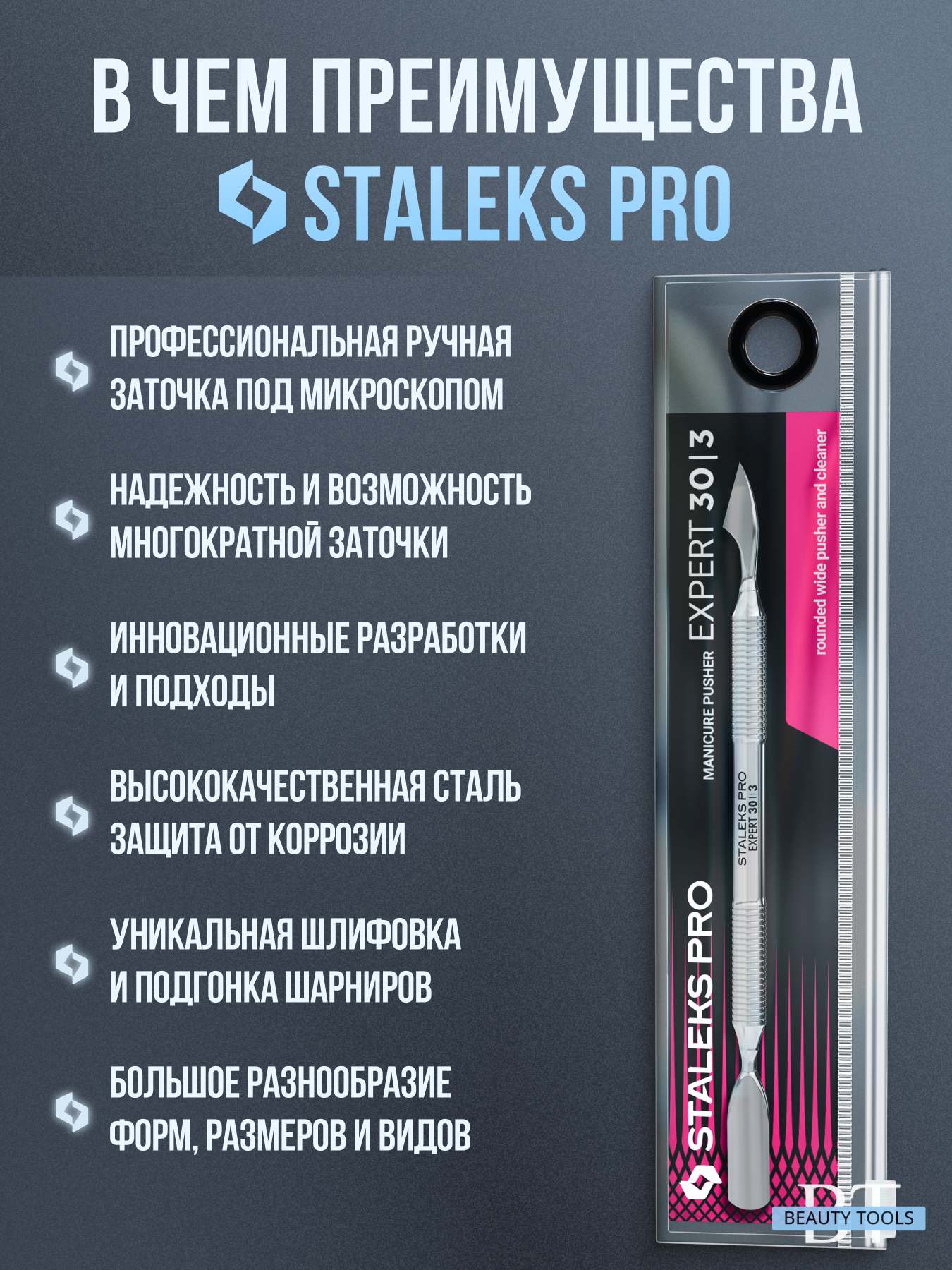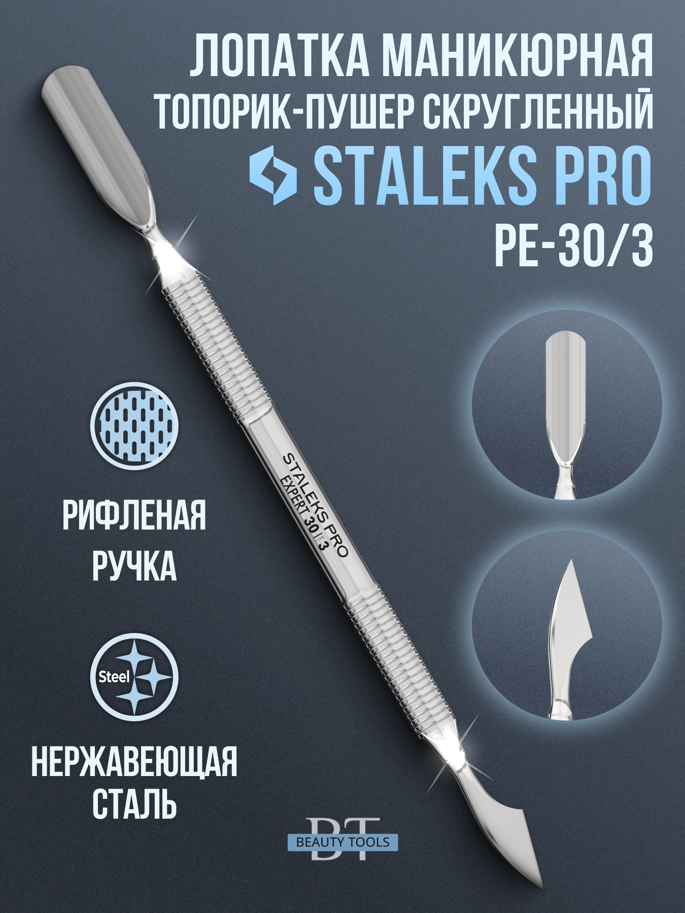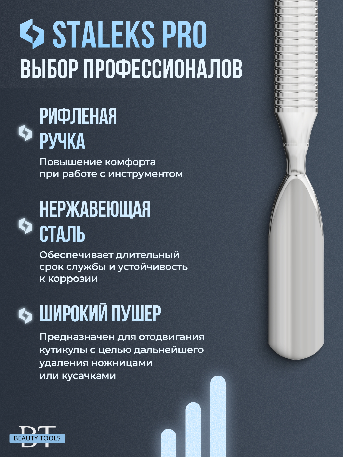 Маникюрная лопатка с двумя рабочими частями. «Скруглённый широкий пушер» предназначен для поднятия и отодвигания грубой кутикулы, а «топорик» применяется для очищения ногтевой пластины от птеригия. Инструмент изготовлен из нержавеющей стали, поддаётся всем видам дезинфекции и стерилизации.