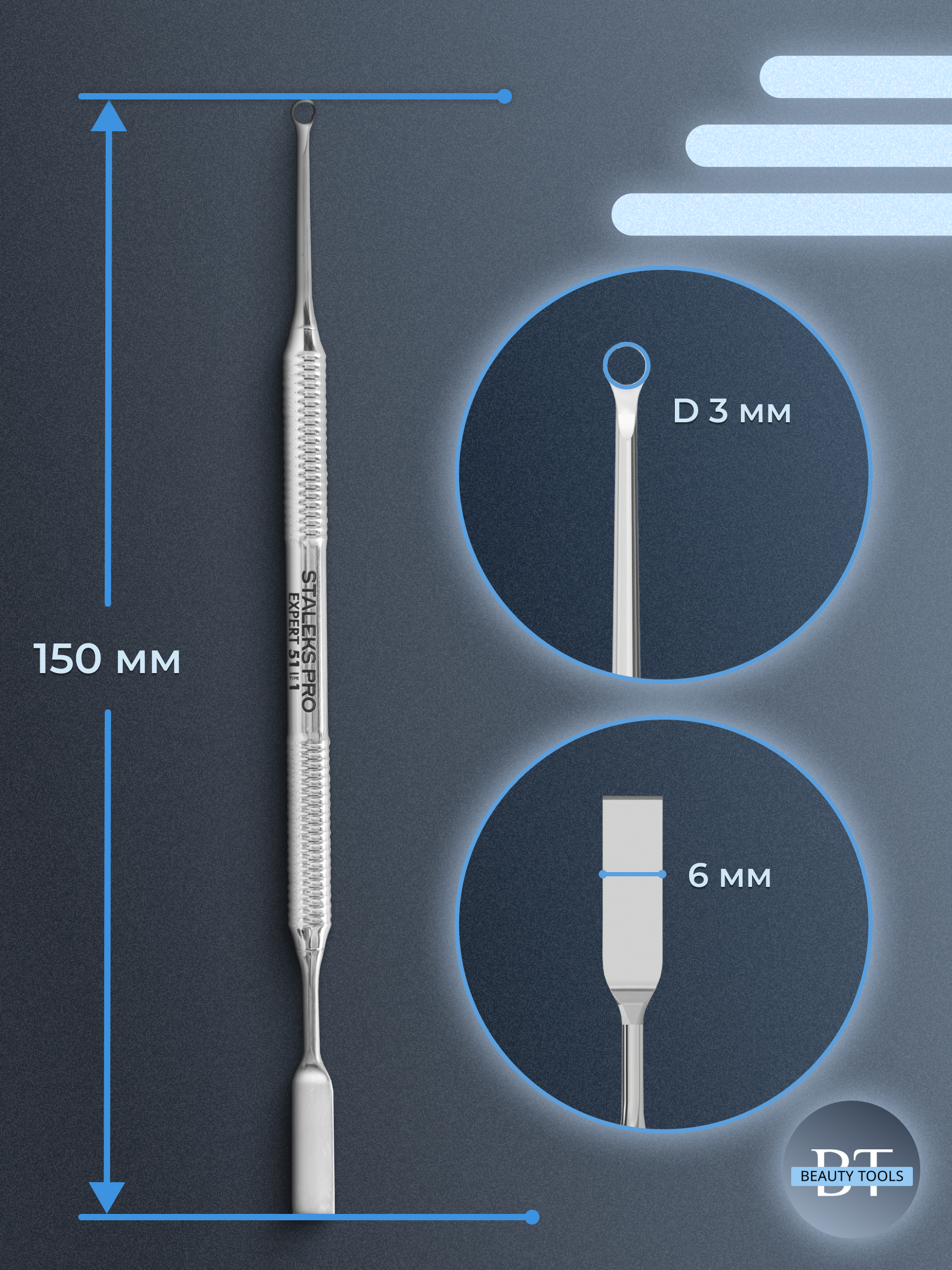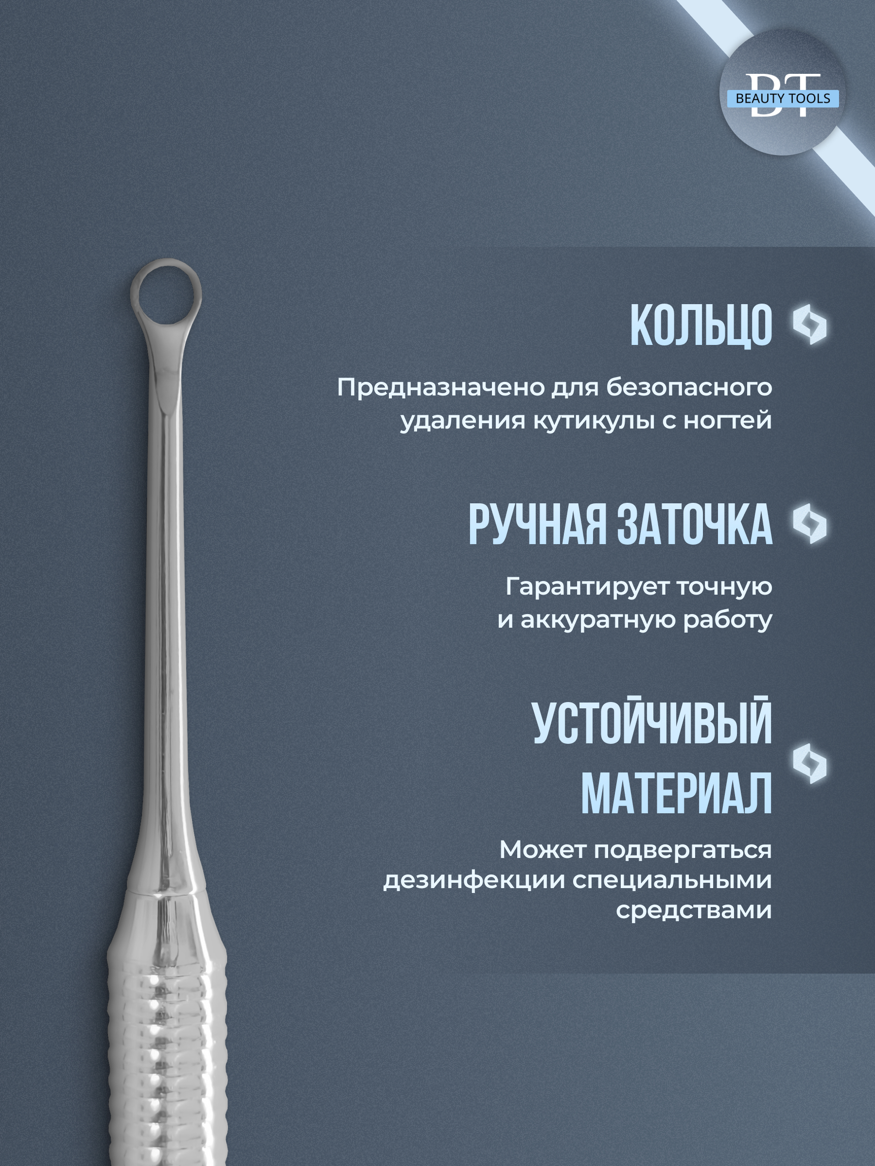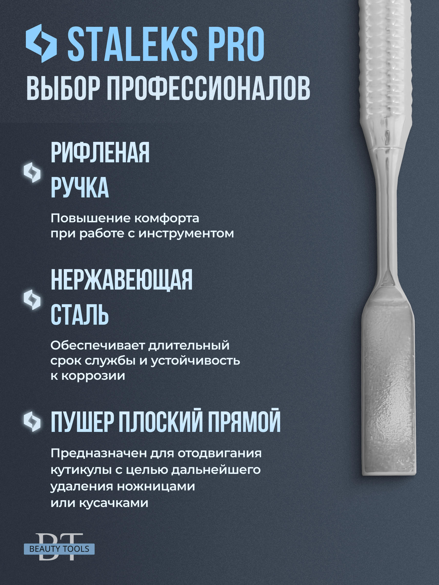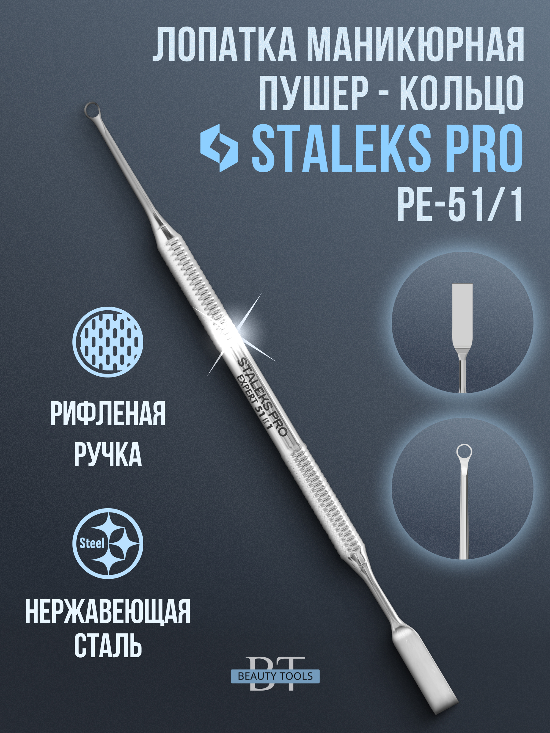 Маникюрная лопатка с двумя рабочими частями. «Плоский прямой пушер» предназначен для поднятия и отодвигания грубой кутикулы, а «кольцо» подходит для удаления птеригия с ногтевой пластины. Инструмент изготовлен из нержавеющей стали, поддаётся всем видам дезинфекции и стерилизации.