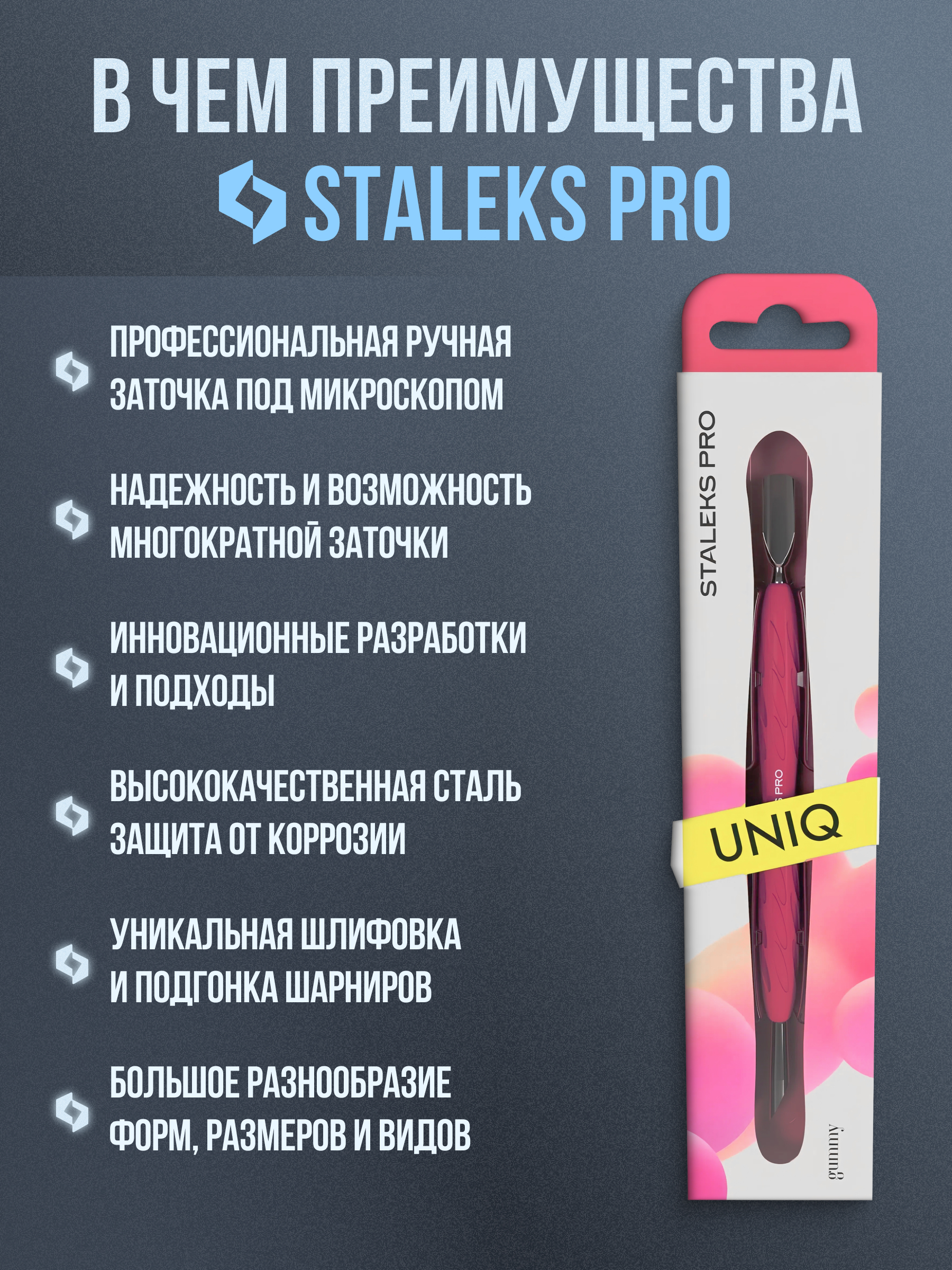 Лопатка маникюрная с силиконовой ручкой "Gummy" Staleks UNIQ 10 TYPE 2 С одной стороны «скруглённый узкий пушер», а с другой, «скошеный». Инструмент предназначен для поднятия и отодвигания кутикулы. Профессиональная ручная заточка рабочих частей гарантирует точную и профессиональную работу. Высоколегированная нержавеющая сталь обеспечивает длительный срок службы и устойчивость к коррозии. Стальные рабочие части и силикон устойчивы к стерилизации в автоклаве без потери качества.