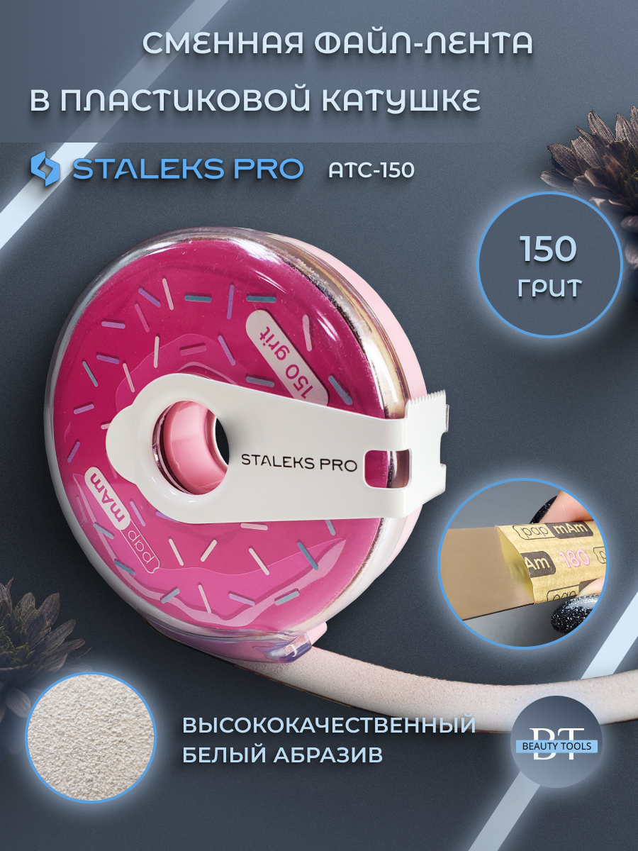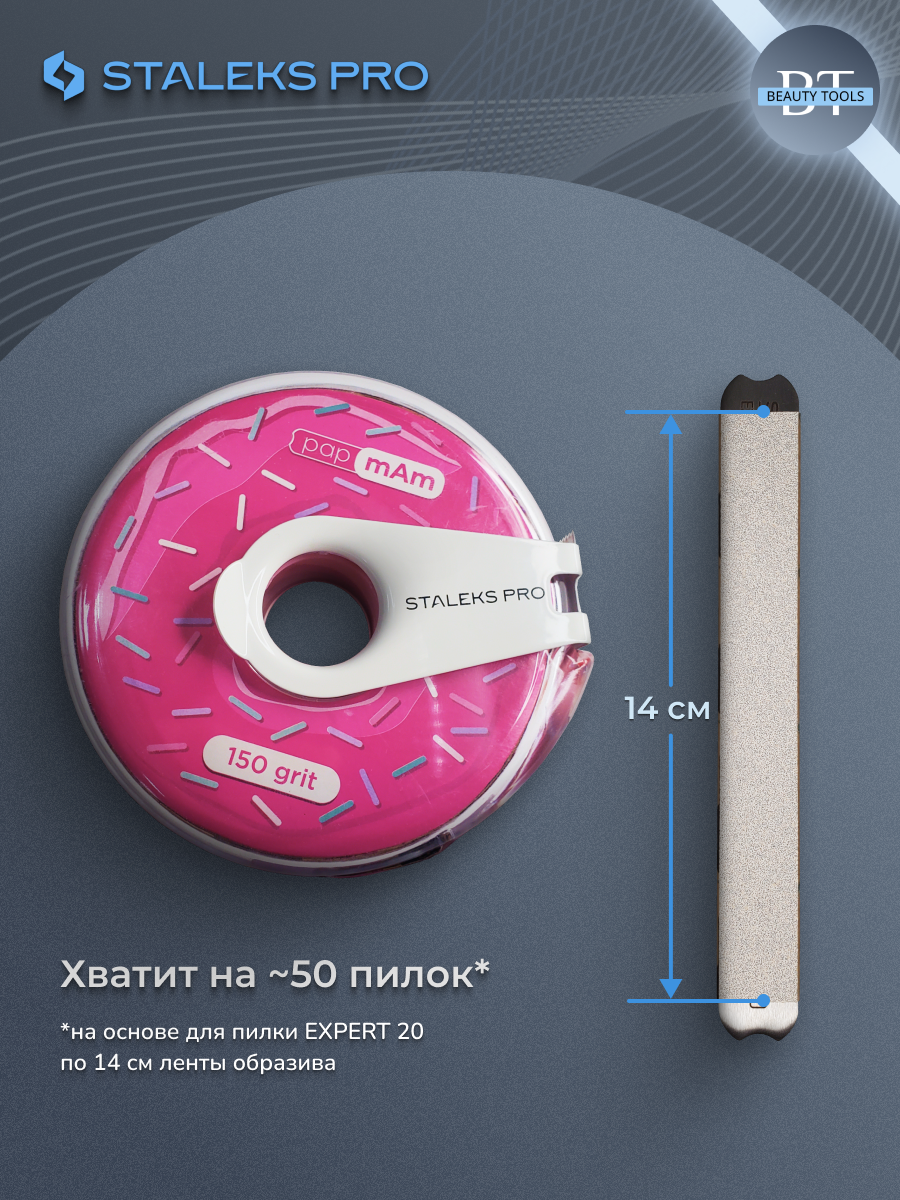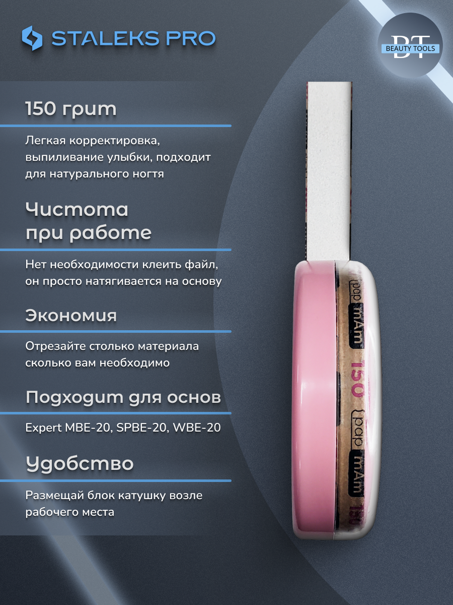 Сменная файл-лента papmAm Bobbinail STALEKS PRO 150 грит в пластиковой катушке. Тонкие файлы простые и удобные в эксплуатации, надёжно фиксируются на основе, не оставляя клея после эксплуатации. Катушка со специальной клипсой для деления абразивной ленты.